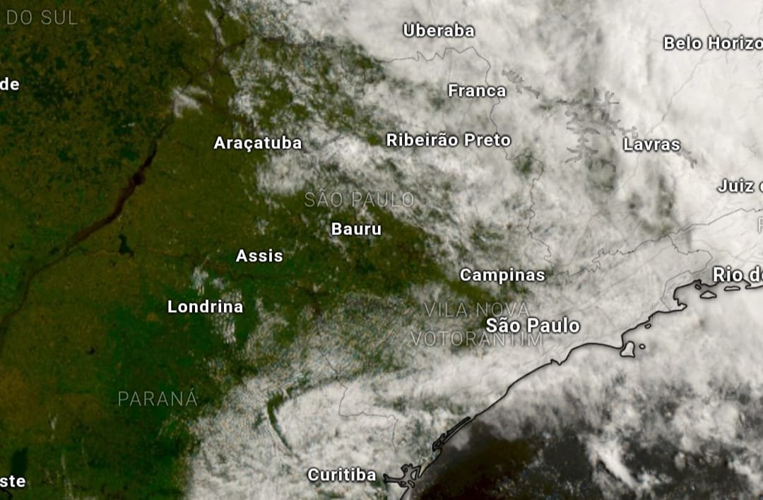 Situação bem parecida com ontem. Ou seja, muitas nuvens na metade leste e céu limpo no oeste do estado de SP.
