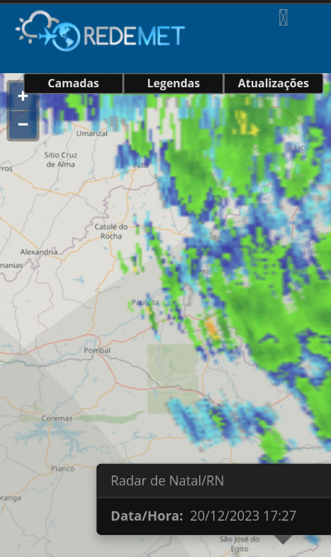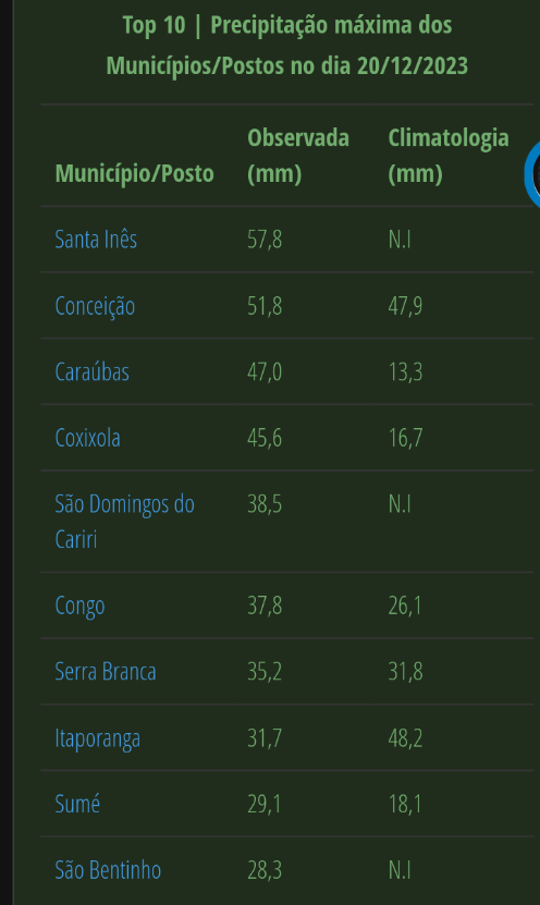 CloudCb Posted December 20, 2023 at 10:02 PM Share Posted December 20, 2023 at 10:02 PM (edited) Já hoje de madrugada, novas instabilidades que se desenvolveram no sertão do RN desceram para o sertão da PB por influência dos ventos de nordeste em baixos níveis, e atingiram Pombal por volta das 4h40. Eu acordei pouco antes das 4h55 com um trovão e a chuva ganhando força. Desse horário até 6h40 mais ou menos, ela caiu com fraca a moderada intensidade, mas em alguns momentos ela veio bem forte. Depois das 6h40 continuou chovendo até às 9h, mas bem mais fraco. Radar das 6h30 de hoje. O ponto vermelho acima é Pombal. Rafael Santos Esse episódio em casa deu 22,6 mm, que juntando com os 10 mm de ontem, dá 32,6 mm ao todo, superando a média de dezembro. ______ Em outras regiões da PB também choveu bem, principalmente no alto Vale do Piancó (onde houve os volumes acima de 50 mm) e no Cariri paraibano: O maior volume caiu em Santa Inês: Os dados são da AESA. Edited December 20, 2023 at 10:03 PM by CloudCb 11 1 Link to comment Share on other sites More sharing options...