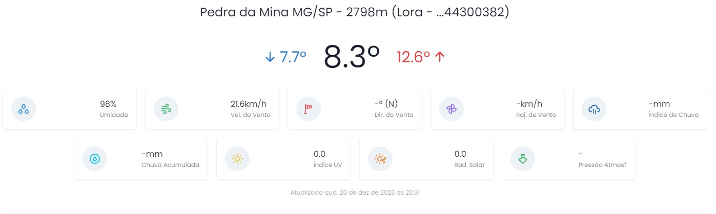 Enio Rezende Posted December 21, 2023 at 10:13 PM Share Posted December 21, 2023 at 10:13 PM Dia típico de dezembro com sol, calor e pancada de chuva. Hoje tive mínima de 18°, máxima de 29° e precipitação de 17mm. O acumulado de chuva no mês na média das estações do CEMADEN em Cons. Lafaiete está em 178mm Agora, 19:15, céu limpo com poucas nuvens, meu termômetro marca 21,8° 8 Link to comment Share on other sites More sharing options...