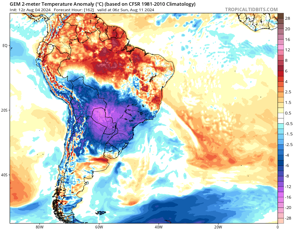 LeoP Posted August 5, 2024 at 02:34 PM Share Posted August 5, 2024 at 02:34 PM (edited) Bom dia! Meteored prevendo mínimas entre 4 e 5°C pra São Paulo capital já no curto prazo. Não é fim de grande, mas para os próximos dias e ainda uma excelente sequência de mínimas abaixo de 10. Se confirmado, seria uma das maiores ondas de frio do século na cidade. Outros institutos sugerem soluções diferentes, mas há um consenso para o maior resfriamento do ano com folga. Pra cá, segue oscilando, mas todas as saídas mostram um bom resfriamento, o melhor do ano, com chance de chuva no sábado e mínimas baixando até os 9ºC no dia seguinte. Advecção de qualidade. Curioso que a previsão coincide quase que exatamente com o análogo que venho comentando aqui, de 1984, com a diferença de ocorrer cerca de 1 semana antes e com mínimas menores (naquele ano, deve ter sido mais úmido, com ótimas máximas e mínimas sem destaque). ------------------------------ BH seguiu o final de semana todo sob variação de nuvens, sol e vento. A temperatura subiu um pouco menos do que o que era previsto. Edited August 5, 2024 at 02:34 PM by LeoP 10 Link to comment Share on other sites More sharing options...
