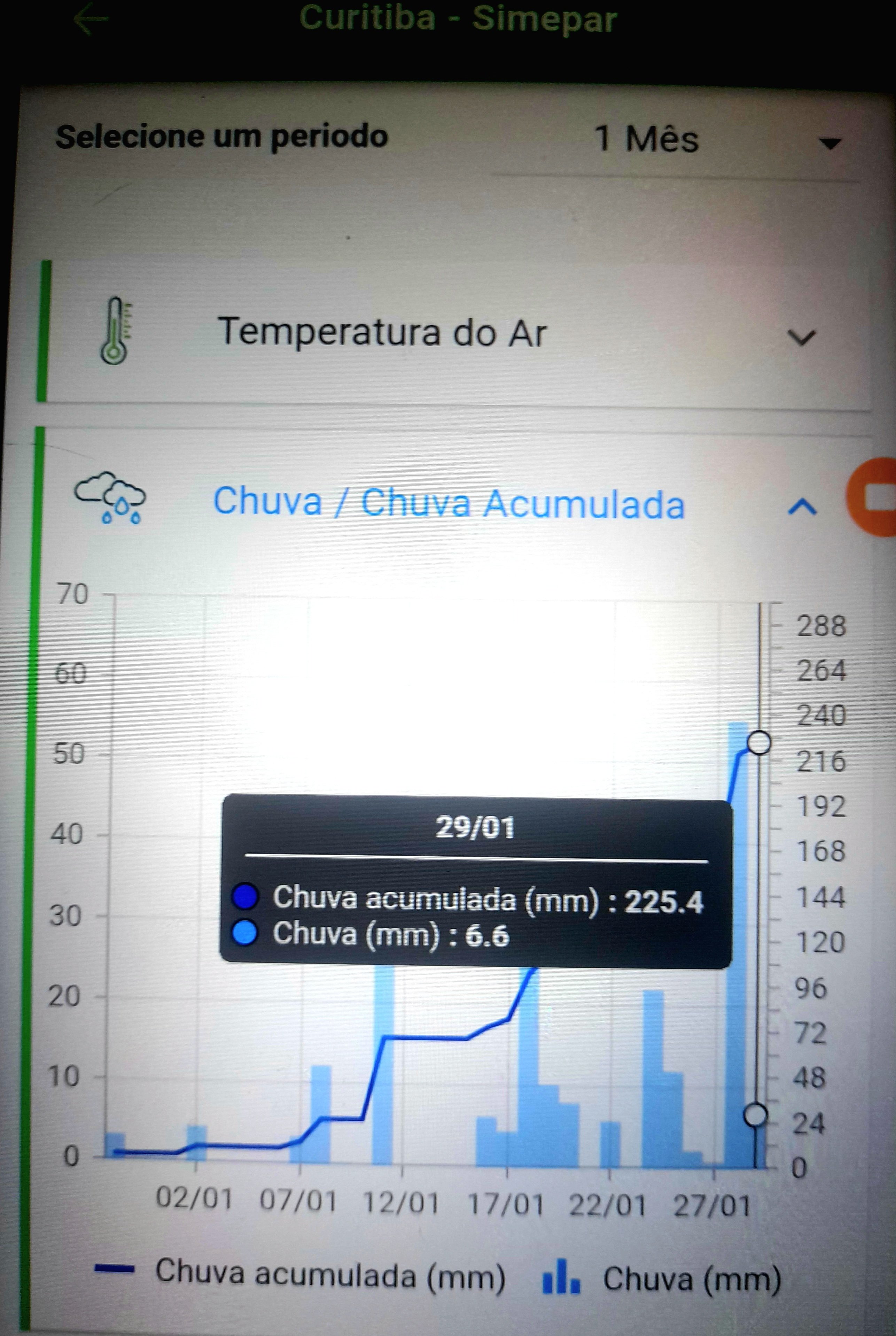 Carlos Campos Posted January 29, 2025 at 11:47 AM Share Posted January 29, 2025 at 11:47 AM Bom dia... Variação ontem 18,1°C e 27,2°C Tem chovido praticamente todos os dias aqui no leste paranaense, porém em pontos isolados. Algumas vezes os acumulados são elevados em determinados locais, como por exemplo ontem, em q choveu 90mm na região do bairro Atuba, quase divisa Curitiba/Pinhais. Em Pinhais foram 65mm acumulados em pouco tempo durante a tarde. Ocorreram aqui na vila descargas atmosféricas muito fortes, com queda de raios e também chuva forte sem ventania. Em casa, 27mm. Vista Noroeste ontem de tarde. 10 Link to comment Share on other sites More sharing options...