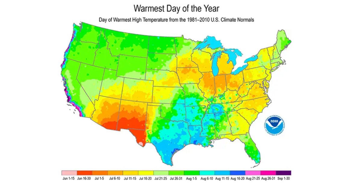 Wagner97 Posted June 8, 2025 at 06:06 PM Share Posted June 8, 2025 at 06:06 PM Em 06/06/2025 em 16:51, Carlos Campos disse: Não sei... Estou achando meio quente - olhando o mapa das temperaturas agora. É meio-início da tarde, dependendo da região. Só lá nas alturas (Wyoming, Idaho, Montana, Colorado) e uma parte próxima dos Lagos está fresco. Me parece que até a costa oeste está quente e deve ser o q? Meio-dia? Mas já adianto que não conheço muita coisa do "normal" por lá em Junho. Mapa do dia mais quente do ano em cada região dos EUA. Para o Arizona, Novo México e extremo oeste do Texas, é agora em Junho. Para a maior parte do país, é de meados para fins de Julho. Na Louisiana, Alabama e sudeste do Texas, o ápice do calor é em meados de Agosto, e para a costa oeste, pegando desde o litoral sul da Califórnia até Washington, o período mais quente do ano ocorre entre o final de agosto e meados de setembro. Bem curioso né? 3 2 Quote Link to comment Share on other sites More sharing options...
