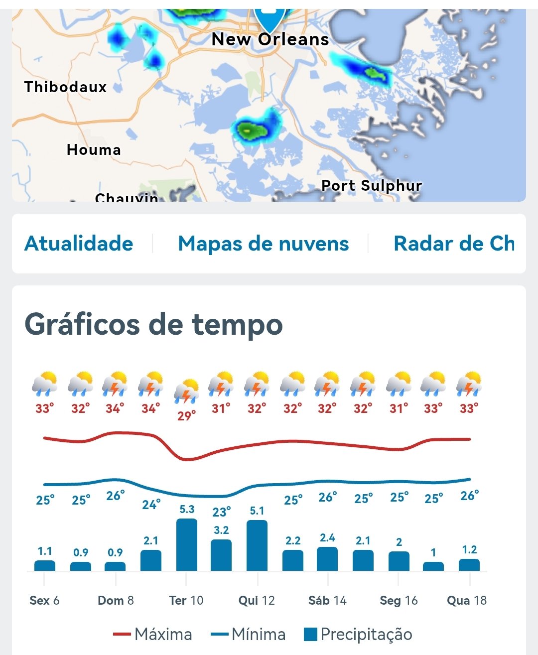 Carlos Campos Posted June 6, 2025 at 09:54 PM Share Posted June 6, 2025 at 09:54 PM Em 06/06/2025 em 18:00, Leandro A M Leite disse: New Orleans, que há pouco mais de quatro meses teve uma nevasca inédita, não vai sequer baixar de 25ºC nos próximos 10 dias, máximas entre 31ºC e 34ºC. Delícia de clima. Longe da cidade, claro. Há vc deve achar q tô de zoação. Não, meu amigo.. Olha essa sequência de trovoadas. 1 1 Quote Link to comment Share on other sites More sharing options...
