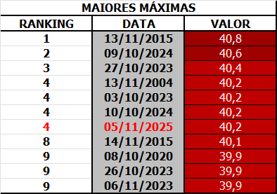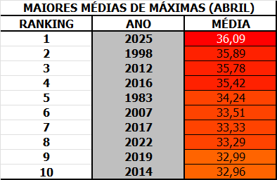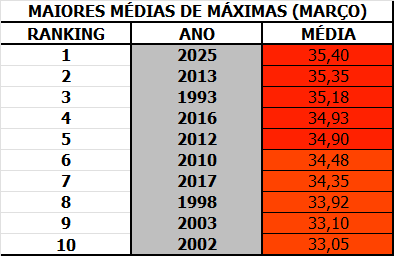 Darley Posted November 11, 2025 at 12:02 AM Share Posted November 11, 2025 at 12:02 AM (edited) @Aldo SantosQuantas vezes o Mirante registrou máximas de 35 graus ou mais desde 2012? Desde então, apenas 2013, 2018 e 2022 não passaram dessa marca. 2025 será mais um ano com máxima acima de 35. Edited November 11, 2025 at 12:02 AM by Darley Quote Link to comment Share on other sites More sharing options...