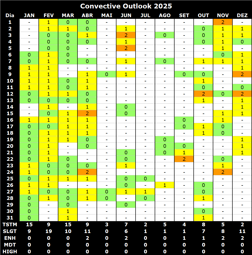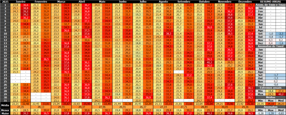 Matheus b Santos Posted January 2, 2026 at 04:11 PM Share Posted January 2, 2026 at 04:11 PM (edited) Dados de 2025 na Vila Jamil de Lima (Adamantina) e Presidente Prudente (INMET): Em tese um ano que deve deixar saudades pelo inverno bom, a primavera foi mais fresca que as anteriores, somente setembro que foi quente, não batemos 40ºC, algo que na minha estação só não ocorreu em 2022. Já Prudente: Fechou +0,40ºC acima da média. Janeiro +1,2ºC Fevereiro +1,5ºC Março +1,9ºC Abril -0,2ºC Maio +1,0ºC Junho -0,5ºC Julho -1,0ºC Agosto -0,8ºC Setembro +1,9ºC Outubro -0,5ºC Novembro -0,6ºC Dezembro +0,7ºC Ano +0,4ºC Quanto a chuva esse dezembro foi muito bom, porém nem com ele sendo muito bom o ano fechou na média. Registrei 1.185mm, ou seja, abaixo da média que fica entre (1300/1350) Foi um ano com mais alertas de tempo severo do que o normal, alguns se concretizaram sendo o principal (ventos). Edited January 2, 2026 at 04:11 PM by Matheus b Santos 5 1 Quote Link to comment Share on other sites More sharing options...
