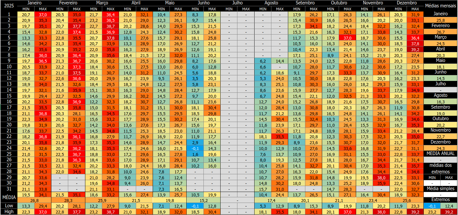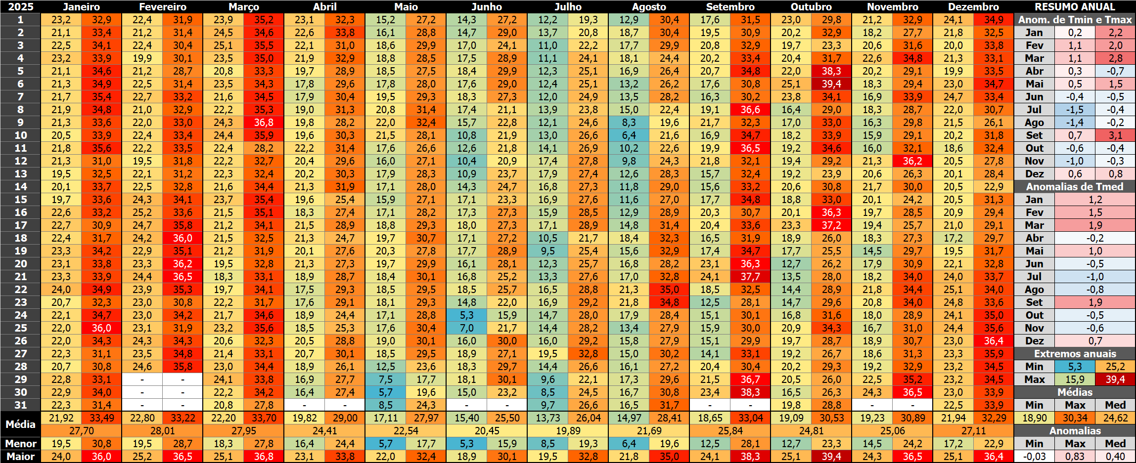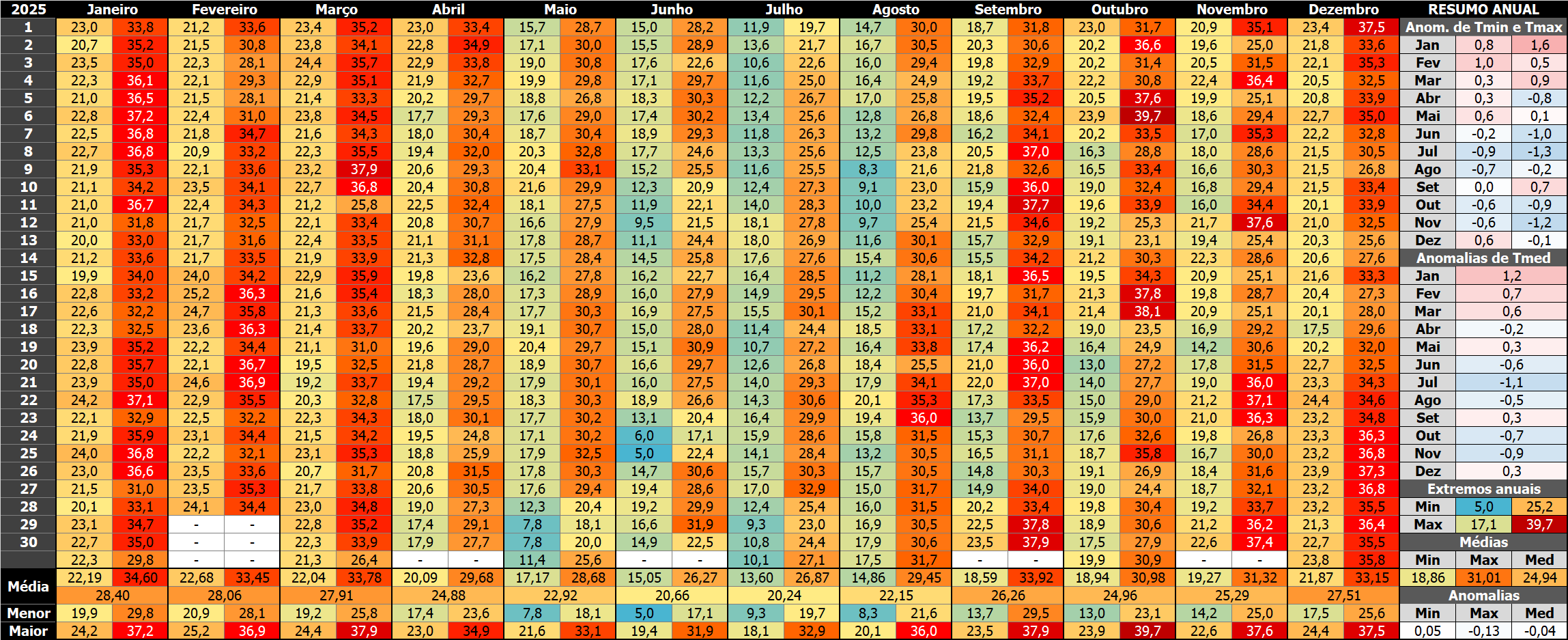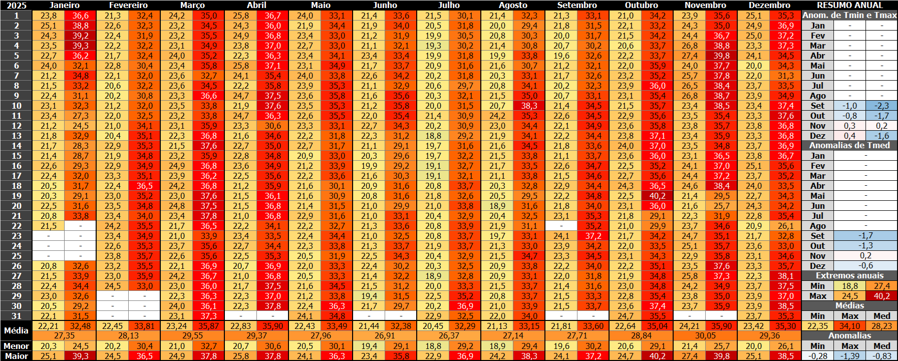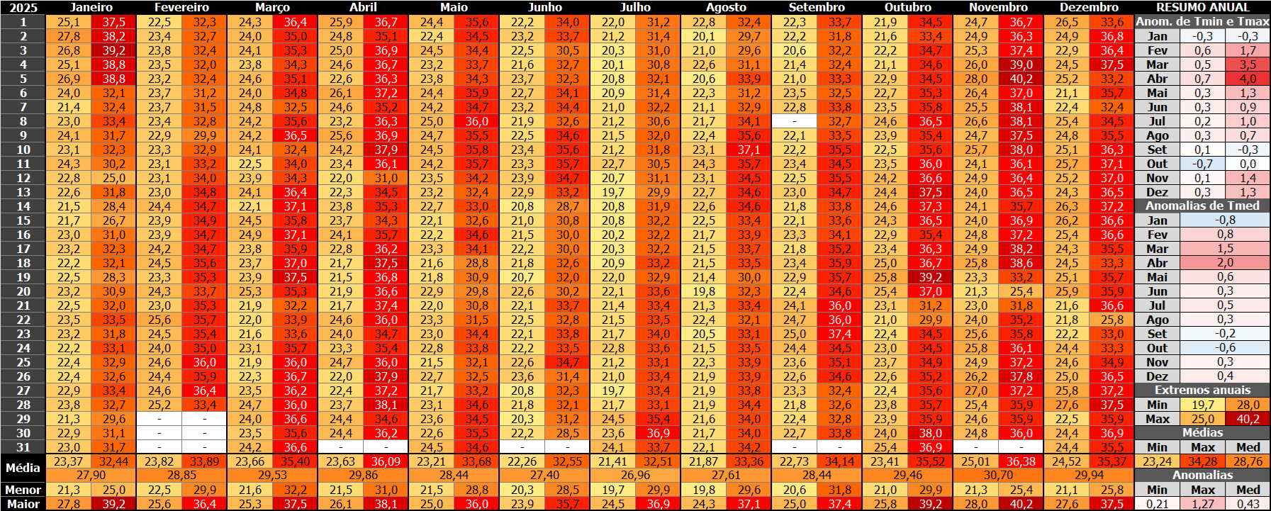 Tstorm Posted January 6, 2026 at 01:45 PM Share Posted January 6, 2026 at 01:45 PM RESUMO DAS TEMPERATURAS EM PAULISTANA E QUEIMADA NOVA - PI EM 2025 - PAULISTANA - PI (INMET): OBS: Todos os dados históricos relativos a máximas (incluindo as anomalias) que serão citados referem-se ao período 1975-2025 (com dados da estação convencional). Já os dados de mínimas e média simples, referem-se apenas a estação automática (desde 2007). Destaques: Com média de máximas de 34,28ºC, 2025 foi 3º ano mais quente da série histórica. A média simples de 28,76ºC também foi a 3ª maior do histórico. Janeiro, apesar de ter sido um dos únicos 3 meses que foram abaixo da média, bateu um recorde de calor: a maior mínima da história de janeiro (27,8ºC no dia 02/01/2025). Janeiro também teve a 2ª, 3ª e 4ª maiores máximas da série do mês. Fevereiro não baixou de 22,5ºC, sendo o fevereiro com a maior "menor mínima" do histórico. Com 35,4ºC, março de 2025 teve a maior média de máximas para março na série. Abril foi uma continuação (ainda pior) de março. Foi o abril com maior média de máximas da história (36,1ºC), sendo 4,0º acima da média. Essa é a maior anomolia positiva considerando todos os meses do histórico. A média de máximas foi superior inclusive a média de outubro, que tem a maior média do ano (35,5ºC). Também foi o mês fora da primavera com maior média de máximas da história. Outubro de 2025 bateu o recorde de menor média simples e menor média de mínimas da automática. A mínima de 21,0ºC, no dia 22, foi a menor temperatura dos registros do mês. Novembro de 2025 não bateu nenhum recorde, mas teve a 4ª maior máxima da história. - QUEIMADA NOVA - PI (ECOWITT): OBS: Os dados até agosto são de uma WS69, que tem um abrigo muito pequeno e, por isso, superaquece nas máximas. A partir de setembro os dados são de um termo-higrômetro WN32 com abrigo de pratos do @kevin cassol, assim os dados desse período são muito mais confiáveis. Contudo, o superaquecimento ainda acontece em dias de pouco vento porque o local é próximo de obstáculos. 5 Quote Link to comment Share on other sites More sharing options...