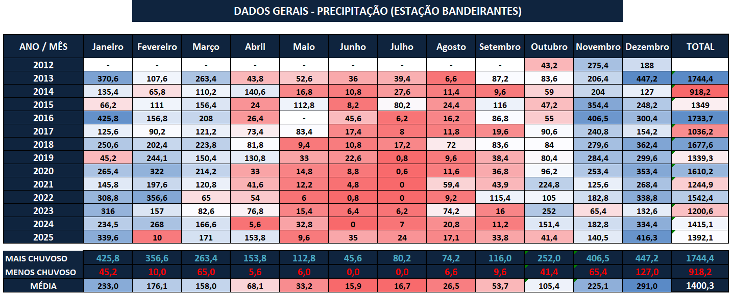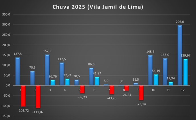 Tstorm Posted January 4, 2026 at 02:34 PM Share Posted January 4, 2026 at 02:34 PM (edited) RESUMO PLUVIOMÉTRICO DE QUEIMADA NOVA - PI EM 2025 - ZONA URBANA: Destaques: Com 545 mm, esse foi o 4º ano mais seco da minha série (2013 - 2025), interrompendo uma sequência de 5 anos de chuvas acima da média. O maior destaque positivo do ano foi janeiro que, com 241 mm, foi o 6º mês mais chuvoso da série. O grande ponto negativo foi o bimestre fevereiro-março, pois teve só 6 mm, mesmo sendo o bimestre com maior média (272,5 mm). Em Paulistana - PI, choveu um pouco mais no bimestre FM (20,8 mm), mas, ainda assim, foi o FM mais seco de sua série histórica (iniciada em 1914). Abril foi muito irregular, mas foi o 3º abril mais chuvoso da minha série, com 135 mm. Dezembro de 2025 (115 mm) também foi o 3º dezembro mais chuvoso do meu histórico. Também foi o 2º dezembro com mais dias de chuva (9 dias). - ZONA RURAL (LOCALIDADE SÃO JOSÉ): Esse pluviômetro fica 9 km ao leste da cidade, em um local com média mais baixa em relação a zona urbana, provavelmente porque na cidade a orografia favorece maiores acumulados. Na curta série desse local (dados completos desde 2021), 2025 foi o ano mais seco. Edited January 7, 2026 at 03:28 PM by Tstorm 8 1 Quote Link to comment Share on other sites More sharing options...
