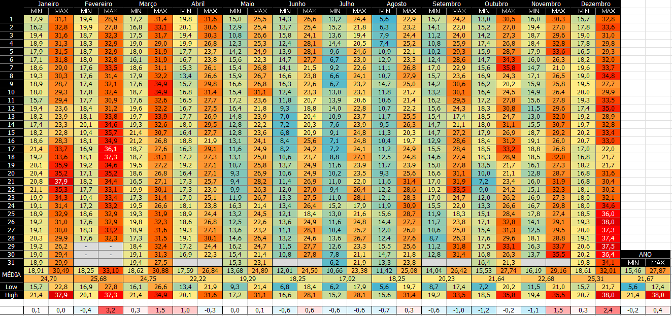 Renan Posted January 2, 2026 at 02:25 AM Share Posted January 2, 2026 at 02:25 AM TODOS OS DIAS DE 2025 NO BAIRRO BANDEIRANTES e seus respectivos desvios mensais. Note como a onda de calor do final de Dezembro se destaca. 4 1 Quote Link to comment Share on other sites More sharing options...