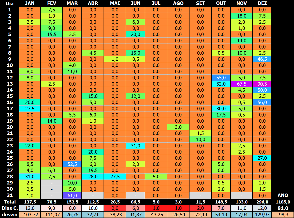 Renan Posted January 2, 2026 at 02:22 AM Share Posted January 2, 2026 at 02:22 AM Confiram os dados de precipitação na minha estação em Juiz de Fora, bairro Bandeirantes, desde o início da série até o final de 2025: Note que as cores não representam desvios de precipitação média, mas tão somente os valores absolutos de chuva. 4 1 Quote Link to comment Share on other sites More sharing options...