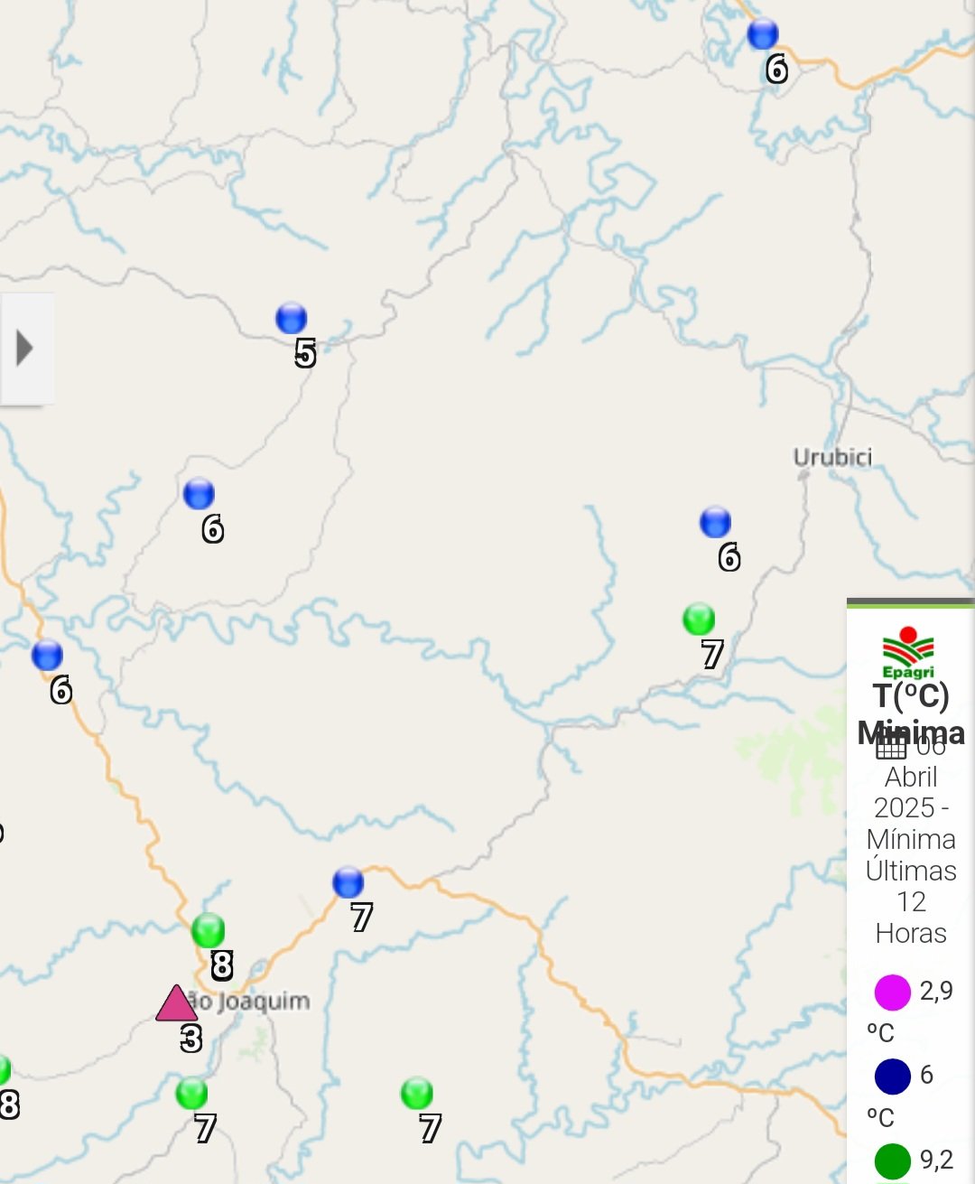 Moretão Posted April 5, 2025 at 01:22 PM Share Posted April 5, 2025 at 01:22 PM (edited) Primeira negativa no sul, primeira negativa em SC: -0,21°C - Urupema/Parque de Exposição 0,4°C - Painel/Fazenda Velha 2,8°C - Bom Jardim da Serra/Terra do Gelo/PMBJS 3,8°C - São Joaquim/Nova Serrana* 3,83°C - Urubici/Vacas Gordas 4,42°C - Campo Belo do Sul/BAESA 4,8°C - Monte Carlo/Agropecuária Bom Jesus 4,98°C - Palmeira/Cerro Alto 5,04°C - Frei Rogério/Núcleo Celso Ramos 5,47°C - Otacílio Costa/Águas Paradas 5,54°C - Tangará/Marari 5,68°C - Água Doce/Herciliópolis/Epagri, Campos Novos/Epagri e Ponte Alta do Norte 5,7°C - Curitibanos/INMET 5,81°C - Ibiam/Linha Santa Lucia 5,82°C - Brunópolis/Centro 5,86°C - Vargem/Centro 5,88°C - Lebon Régis/Fazenda Fertilidade 5,99°C - Fraiburgo/Liberata/Epagri *São Joaquim ainda registrou 3,09°C em Santa Izabel, mas esta estação apresenta máximas erradas e pode estar descalibrada ou mal instalada. Edited April 5, 2025 at 01:59 PM by Moretão 12 3 Link to comment Share on other sites More sharing options...