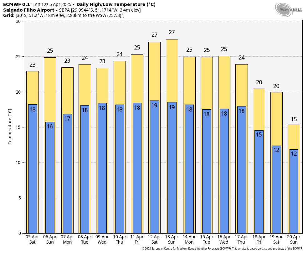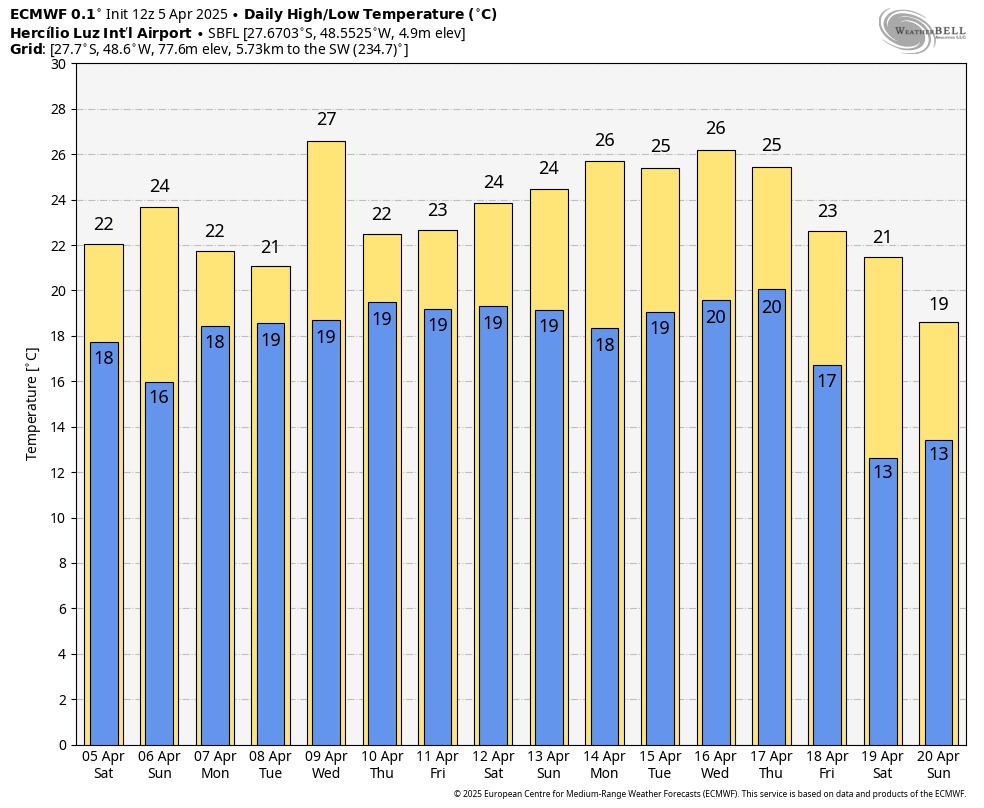 Moretão Posted April 5, 2025 at 11:28 PM Share Posted April 5, 2025 at 11:28 PM ☀️🌤️⛅☁️☁️🌧️ Máxima: 27,6°C em Mondaí/Linha Catres Mínima: -0,21°C em Urupema/Parque de Exposição Menor máxima: 12,4°C em Bom Jardim da Serra/Rio do Rastro Eco Resort Rajada máxima: 73,4 km/h em Florianópolis/Balneário dos Açores Precipitação máxima até o momento: 7,8 mm em Bom Jardim da Serra/Rio do Rastro Eco Resort > Hoje houve a menor mínima e a menor máxima. Amanhã ainda há chance de geada. O tempo está nublado e deve limpar depois, mas não sei se o ar frio ainda terá força e tempo para tal. > Agora as expectativas se concentram para o final do mês onde "parece" que há possibilidade de outra MP. 12 1 Link to comment Share on other sites More sharing options...