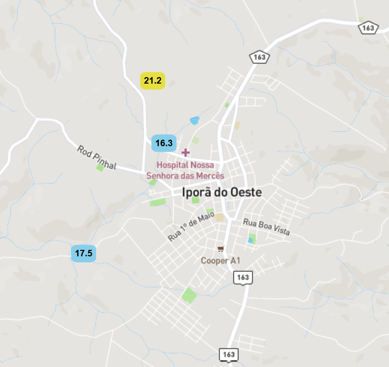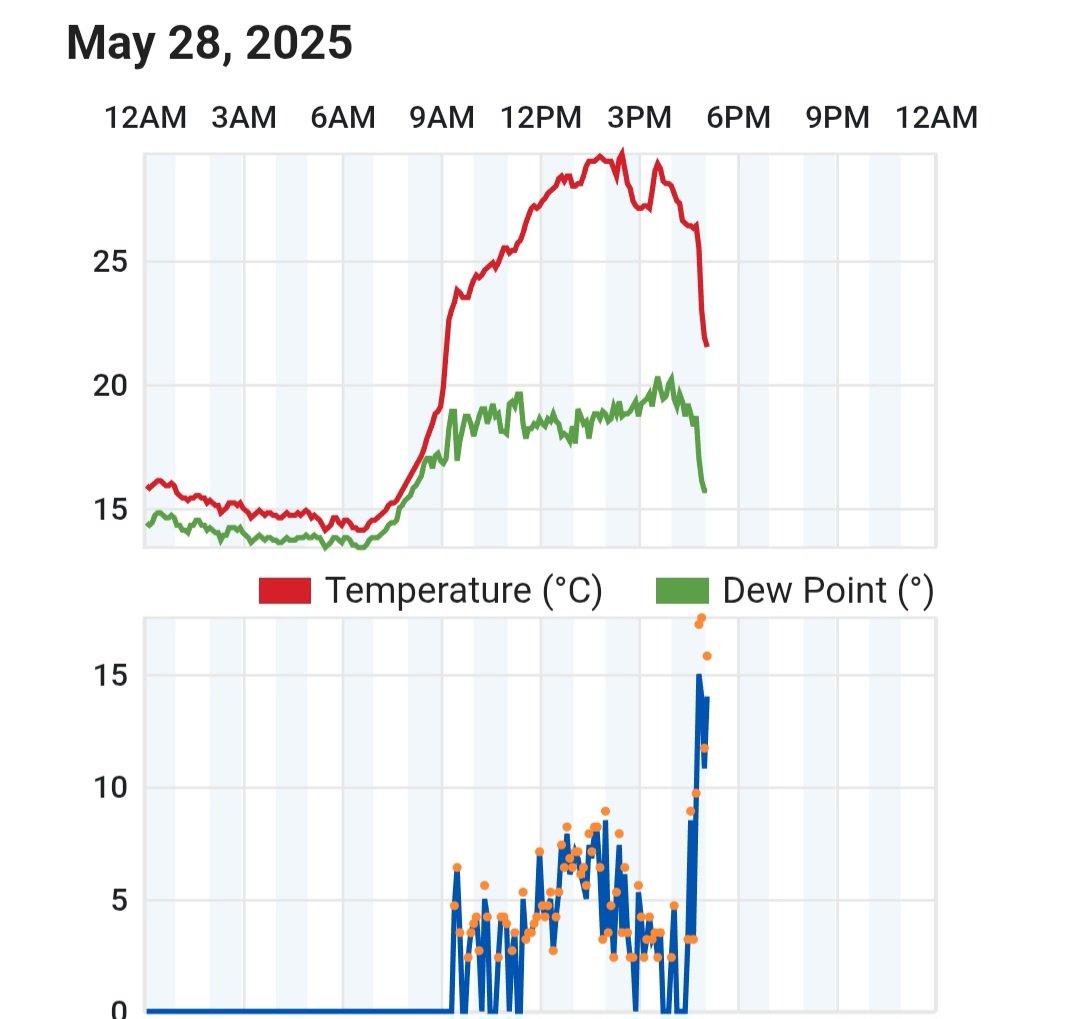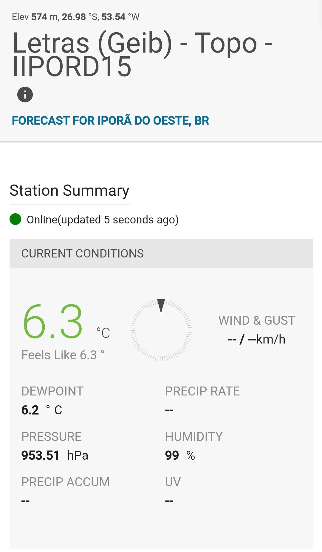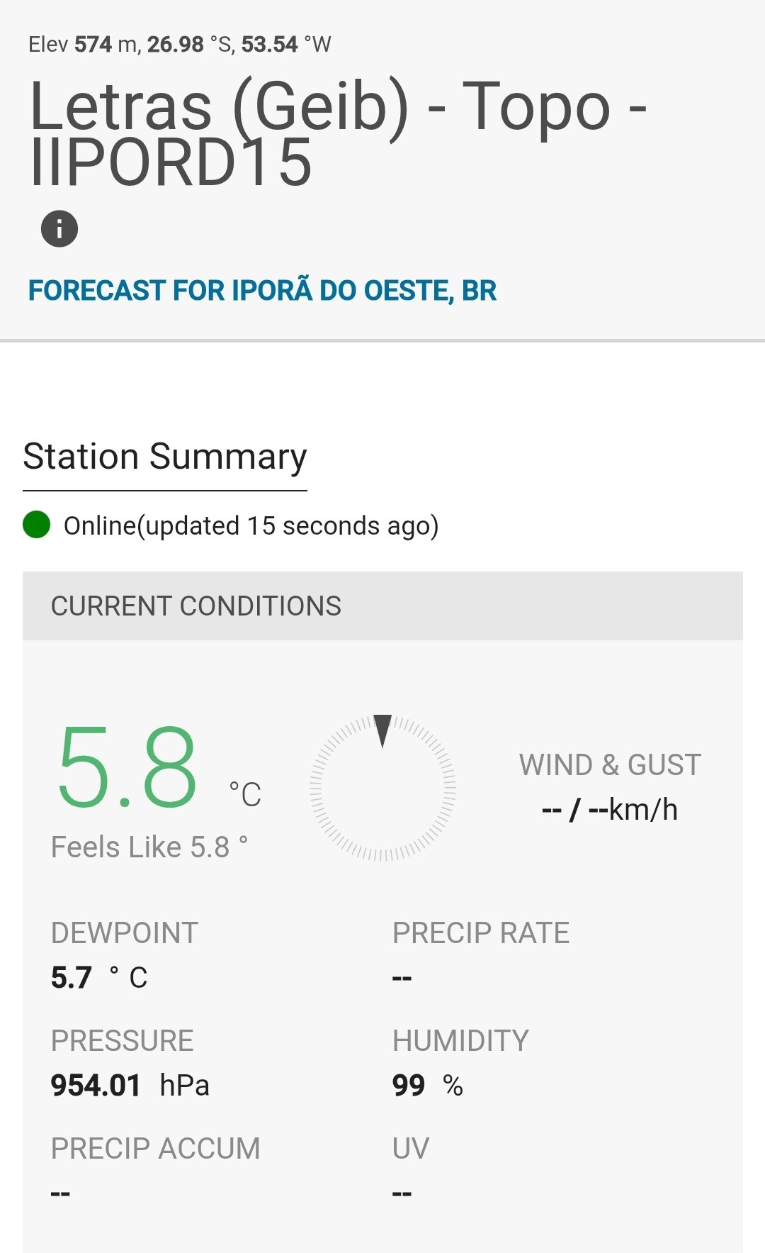 jean10lj Posted May 28, 2025 at 08:56 PM Share Posted May 28, 2025 at 08:56 PM Em 26/05/2025 em 21:04, jean10lj disse: Agora há pouco coloquei uma ecowitt (sensor de temperatura/umidade) num topo aqui em Iporã do Oeste. Como estava sem topo monitorado aqui, decidi me mexer. 575m, não está bem no topo, mas é algo. Esse local vai representar bem a cidade de Iporã do Oeste, que está quase toda acima dos 550m e com o mesmo relevo. Boa parte da cidade está a 570-610m. Amanhã tiro uma foto de longe e de dia do local. Agora: Letras (Geib) - (topo 575m) 21,2C Flor e Ser (baixada 520m) 16,3C Wickert (vale 455m) 17,5C Fotos da ecowitt de Letras/Geib (topo) hj de meio dia: 16 1 Link to comment Share on other sites More sharing options...