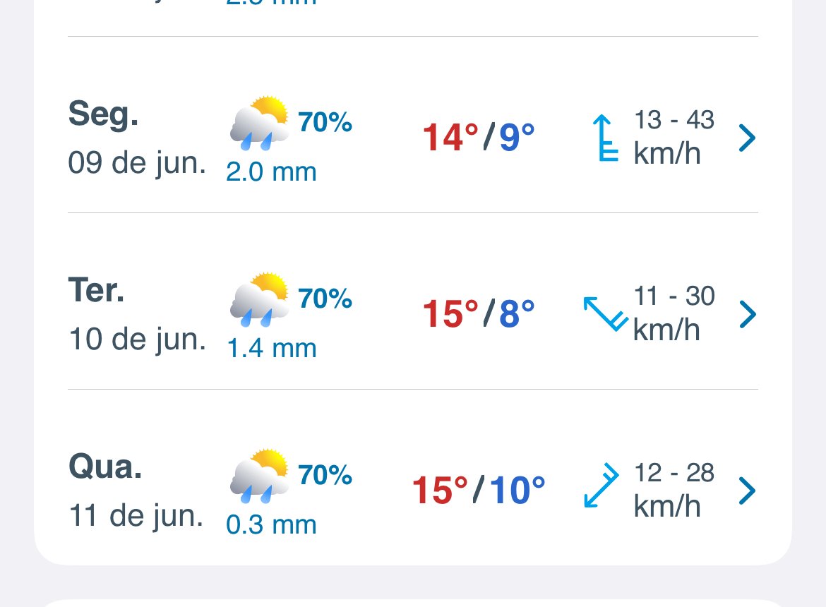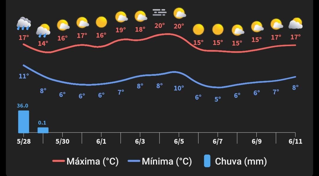 claudio eduardo Posted May 28, 2025 at 11:24 PM Share Posted May 28, 2025 at 11:24 PM Cianorte hoje começou com chuva temperatura entorno dos 17° C variando durante o dia tempo fechado e a tarde manteve os 12 ° sensação menor por causa do vento que rodou entre 30 a 40 km , temperatura em forte declinio no momento previção de 6 ° na madrugada amanhacer. 15 Link to comment Share on other sites More sharing options...