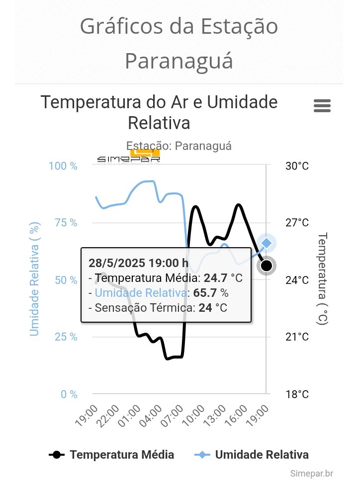 Carlos Campos Posted May 28, 2025 at 10:16 PM Share Posted May 28, 2025 at 10:16 PM Em 28/05/2025 em 18:42, JOÃO MARCOS disse: A temperatura caindo bem Estamos simplesmente com 6°C a mais do que vcs aí em Guarapuava. Infelizmente o posicionamento da baixa sobre o RS está trazendo ar aquecido para o leste, mesmo com ventania contínua de NW. Pra ter uma idéia, Paranaguá - cerca de 90 km à leste de Curitiba tem 25°C agora (19h). Enquanto isso no oeste, Cascavel está com 7°C e Maringá no noroeste está com 11°C. Garoa forte agora e vento soprando com bastante vontade. A previsão de 8°C pra esta noite pode se concretizar nos sonhos de alguém, mas provavelmente só assim. Tem um mapa que o Simepar disponibilizou e mostra claramente o contraste térmico no estado (e no Centro-Sul) É das 17h (duas horas atrás) mas dá uma idéia da situação. As cores realçadas - que eles adoram - e eu não, estão bem didáticas hoje. Risquei alí um erro de temperatura no MS. Está mais frio por lá do que por aqui. Amanhã talvez mude o quadro. 14 Link to comment Share on other sites More sharing options...