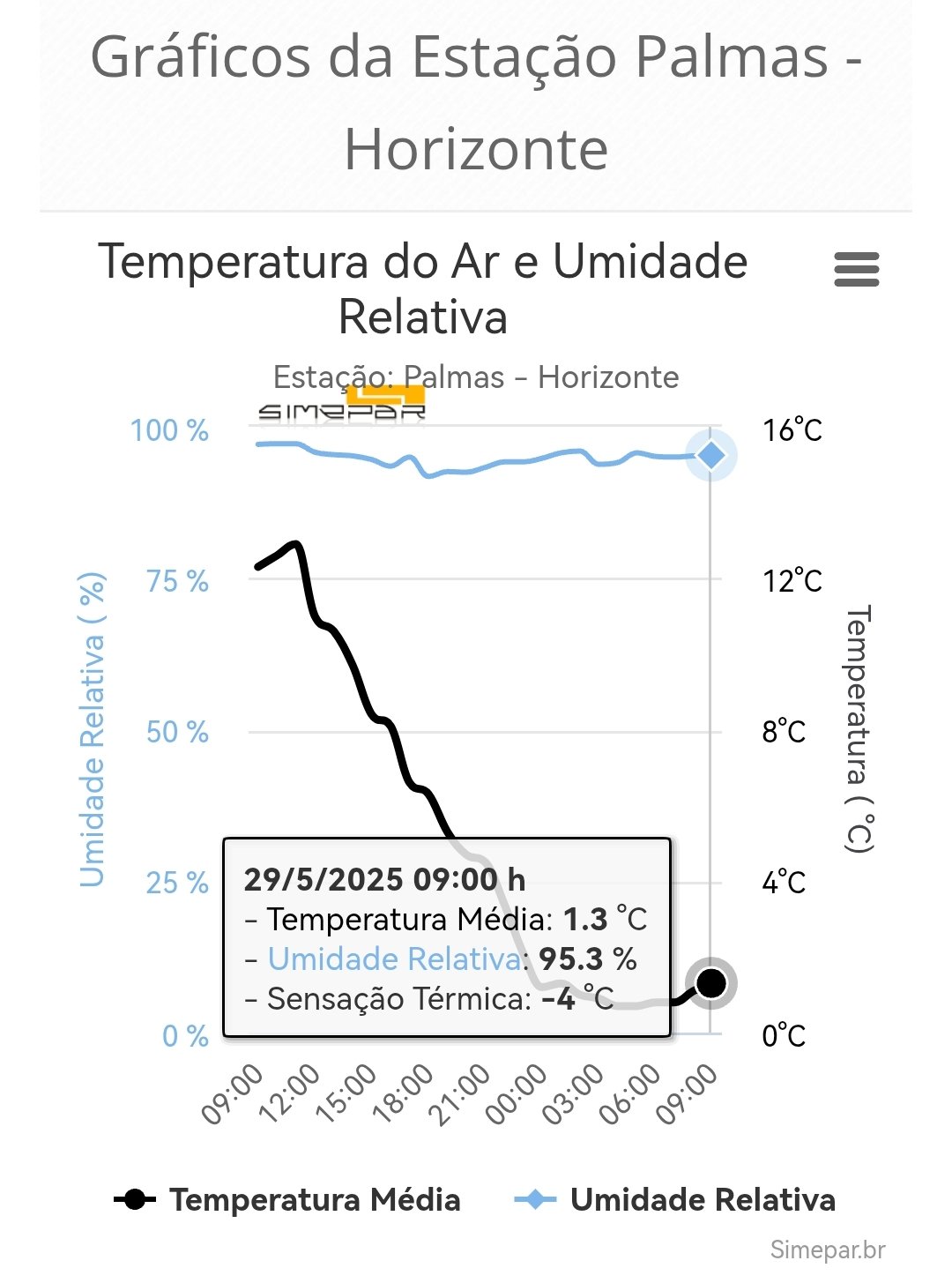 Renan Posted May 29, 2025 at 01:37 PM Share Posted May 29, 2025 at 01:37 PM Em 29/05/2025 em 10:34, Leandro A M Leite disse: Em Primavera do Leste, área urbana: Jardim Europa Davis 12,4ºC UR 95,6% 9:11 HL (mínima foi 11,6ºC) Weatherflow 12,4ºC UR 98% 9:14 HL (mínima foi 12,3ºC) Quanto à neve no Sul, por favor, fotos e vídeos atuais. É uma boa friagem no MT, mas não é extraordinária. Vamos ver como vai se dar em SP (interior). 14 1 Link to comment Share on other sites More sharing options...