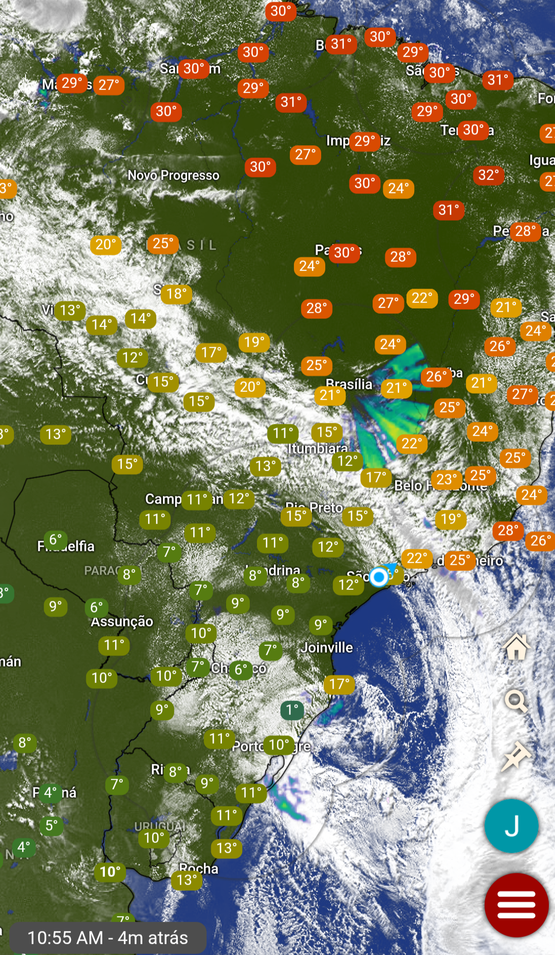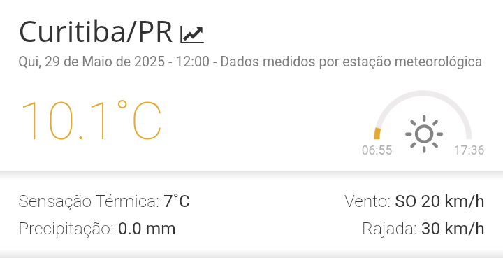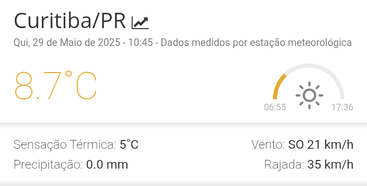 Wagner97 Posted May 29, 2025 at 03:10 PM Share Posted May 29, 2025 at 03:10 PM Em 29/05/2025 em 11:02, jayvillao disse: Guardando essa imagem no fórum, coisa bonita. Aguardar os 7 na madrugada que seria bela marca. Tivemos várias CGE na casa dos 12 nesta madrugada já, com vento forte. Ainda temos vento com pontinha de N, está ONO 15km/h. Agora 15.5° CGE Ipiranga O próprio mirante registrou 12,4°C na automática 11 Link to comment Share on other sites More sharing options...