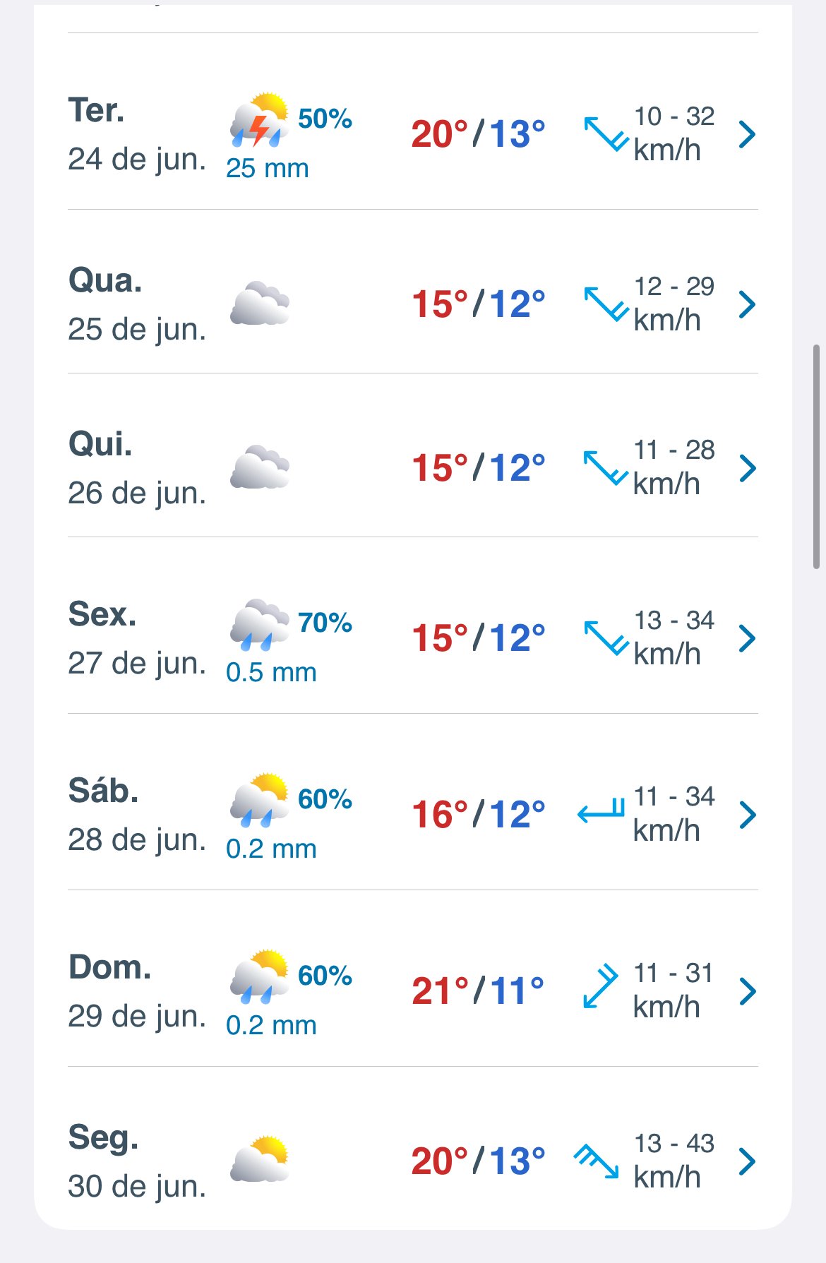 Felipe Backendorf Posted June 17, 2025 at 01:46 PM Share Posted June 17, 2025 at 01:46 PM Em 17/06/2025 em 10:41, Bruno Borg disse: O inverno aqui em Floripa vai de vento em popa, só que não. Meteoblue prevê mínimas e máximas bem acima da média nos próximos dias. O que salva é o vento incessante desde domingo que aumenta a sensação de "frio" mas não da nem de deixar janelas abertas se não voa tudo dentro do apto. Tá um baita vento de norte hoje. O aero registrou vento médio (ou instantâneo?) de 37km/h às 8h e mínima de 18ºC Já faz 22ºC na epagri e no aero às 10h 9 Link to comment Share on other sites More sharing options...