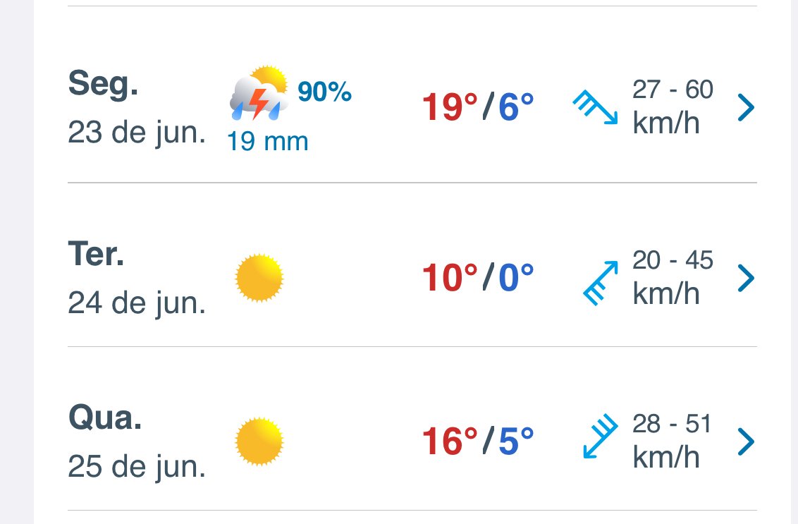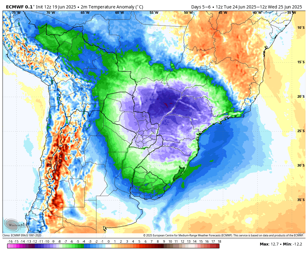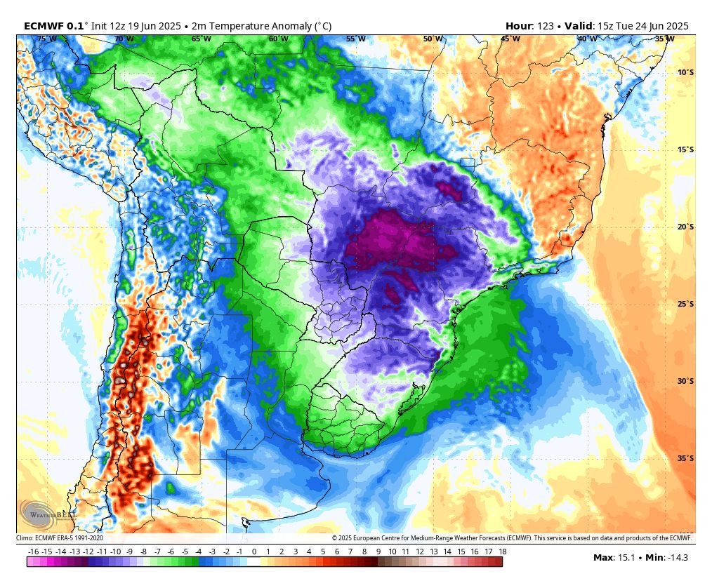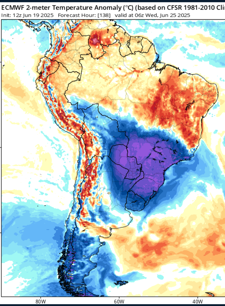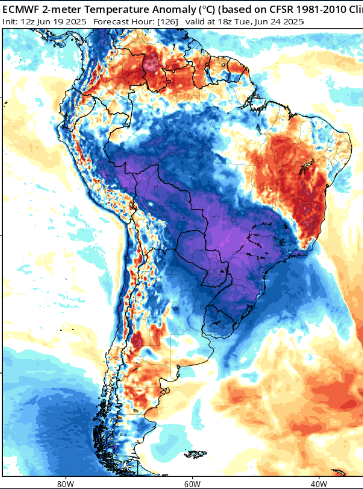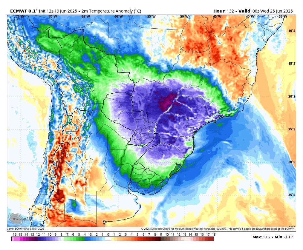 Edison Bocorny Jr Posted June 19, 2025 at 05:41 PM Share Posted June 19, 2025 at 05:41 PM (edited) 12Z GFS manteve a tarde de segunda feira com 10 graus e precipitação aqui, o euro igual, com 12 de máxima terça e 2 de mínima quarta feira. Entretanto, a mp do final do mês que era absurda, tarde de 6 graus e chuva, virou tarde de 13 graus e mínima de 5 início de julho. Distante ainda este outro pulso, mas vi que Chuí, a cidade litorânea mais fria e ventosa do litoral Brasil, terá uma tarde de 8 graus a máxima e rajadas de vento de 65 km/h na segunda feira. Lareira, fogão a lenha, estufa e pinhão para aguentar este clima por lá. Edited June 19, 2025 at 05:42 PM by Edison Bocorny Jr 17 Link to comment Share on other sites More sharing options...