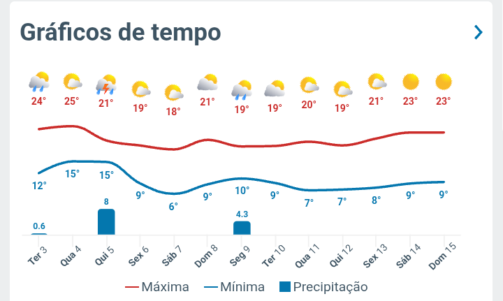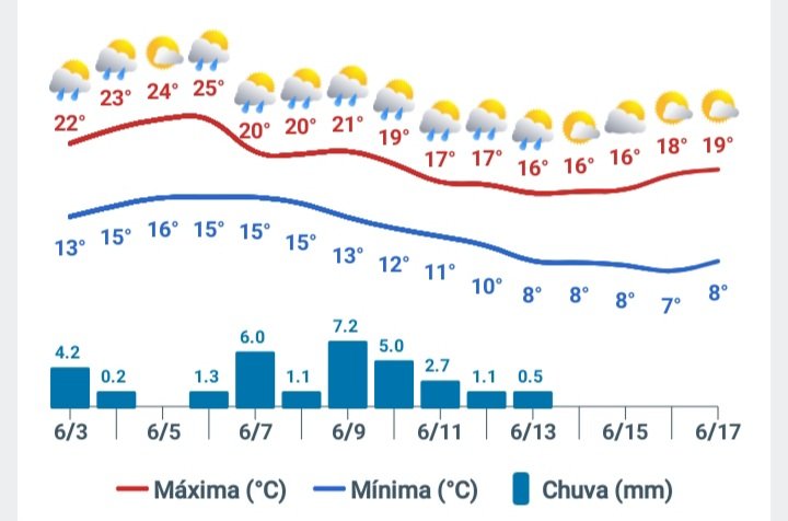 sjmolive Posted June 3, 2025 at 01:57 PM Share Posted June 3, 2025 at 01:57 PM (edited) Bom dia a todos. Aqui no Alphaville JF também vai se consolidando a previsão de período mais frio do ano, até agora, a partir do início da semana que vem. Podemos registrar as menores máximas e mínimas do ano, até agora, pelas previsões. Vejam abaixo as temperaturas previstas de amanhã até quinta da semana que vem. Que se confirmem. Edited June 3, 2025 at 01:58 PM by sjmolive 14 Link to comment Share on other sites More sharing options...