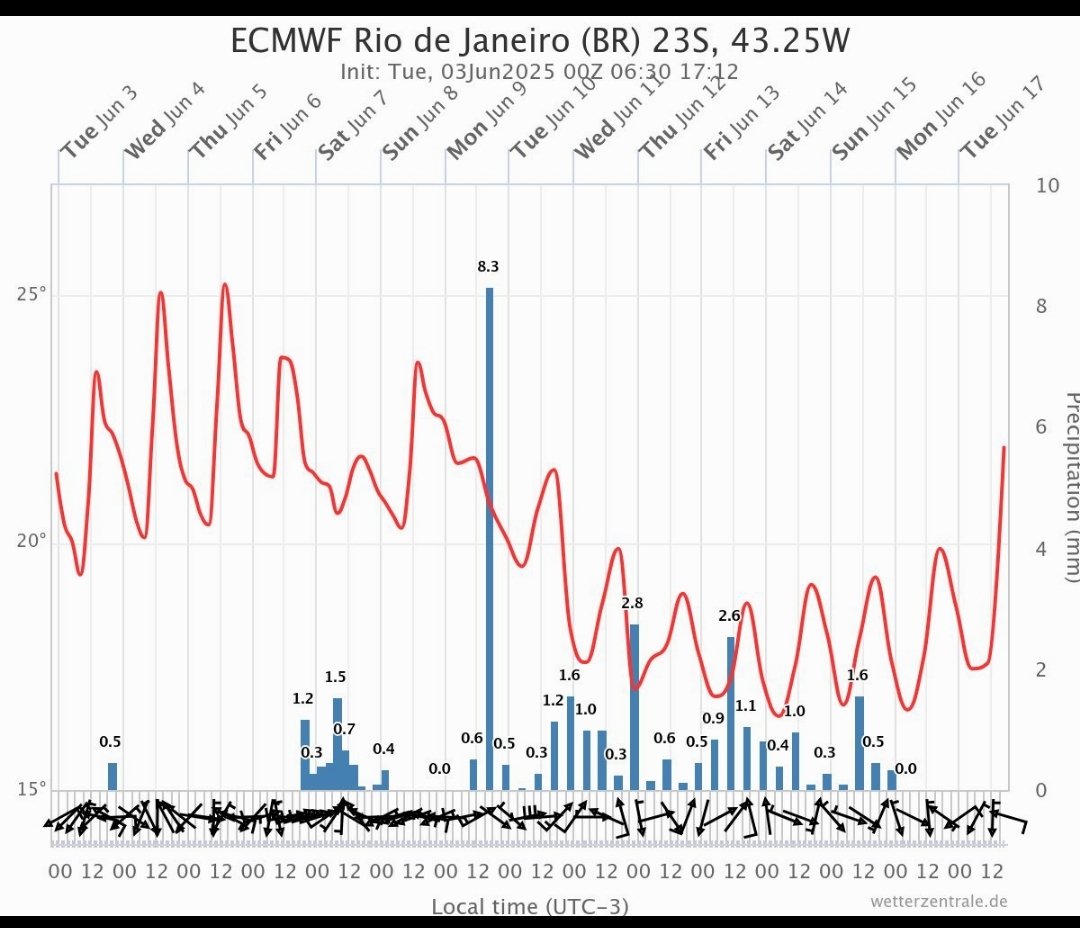 Felipe Backendorf Posted June 3, 2025 at 01:00 PM Share Posted June 3, 2025 at 01:00 PM Ontem foi um dia nublado na capital catarinense com extremos 12,8/19,9ºC, o sol pouco apareceu. Hoje a mínima foi alta: 16,6ºC e está bem escuro, talvez chova. Amanhã é o único dia com previsão de 'calor' na grade de 10 dias do ECMWF, sol e uns 24/26ºC de máxima. 19 Link to comment Share on other sites More sharing options...