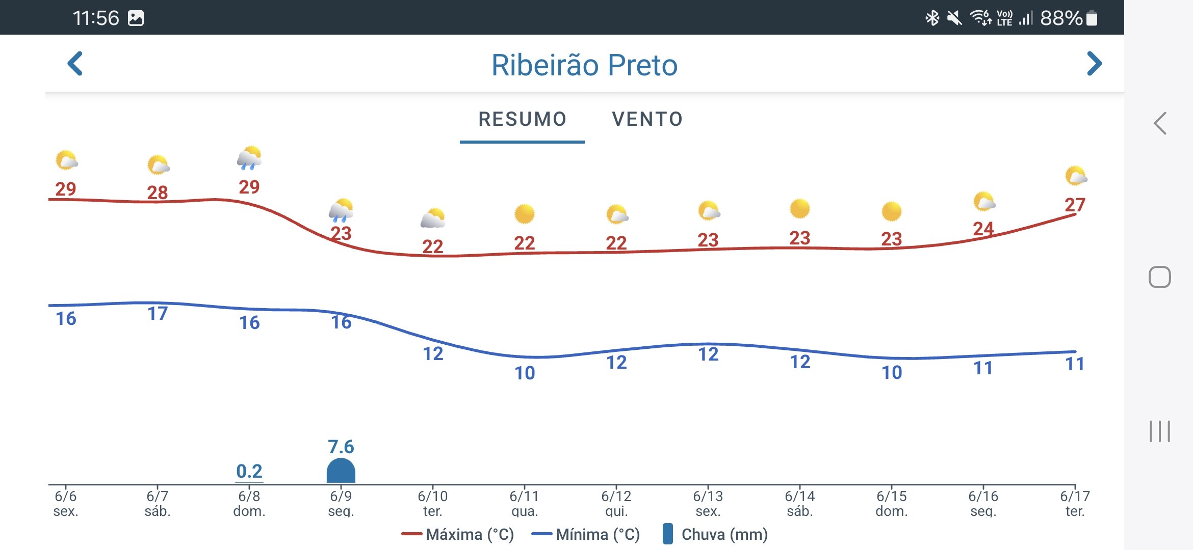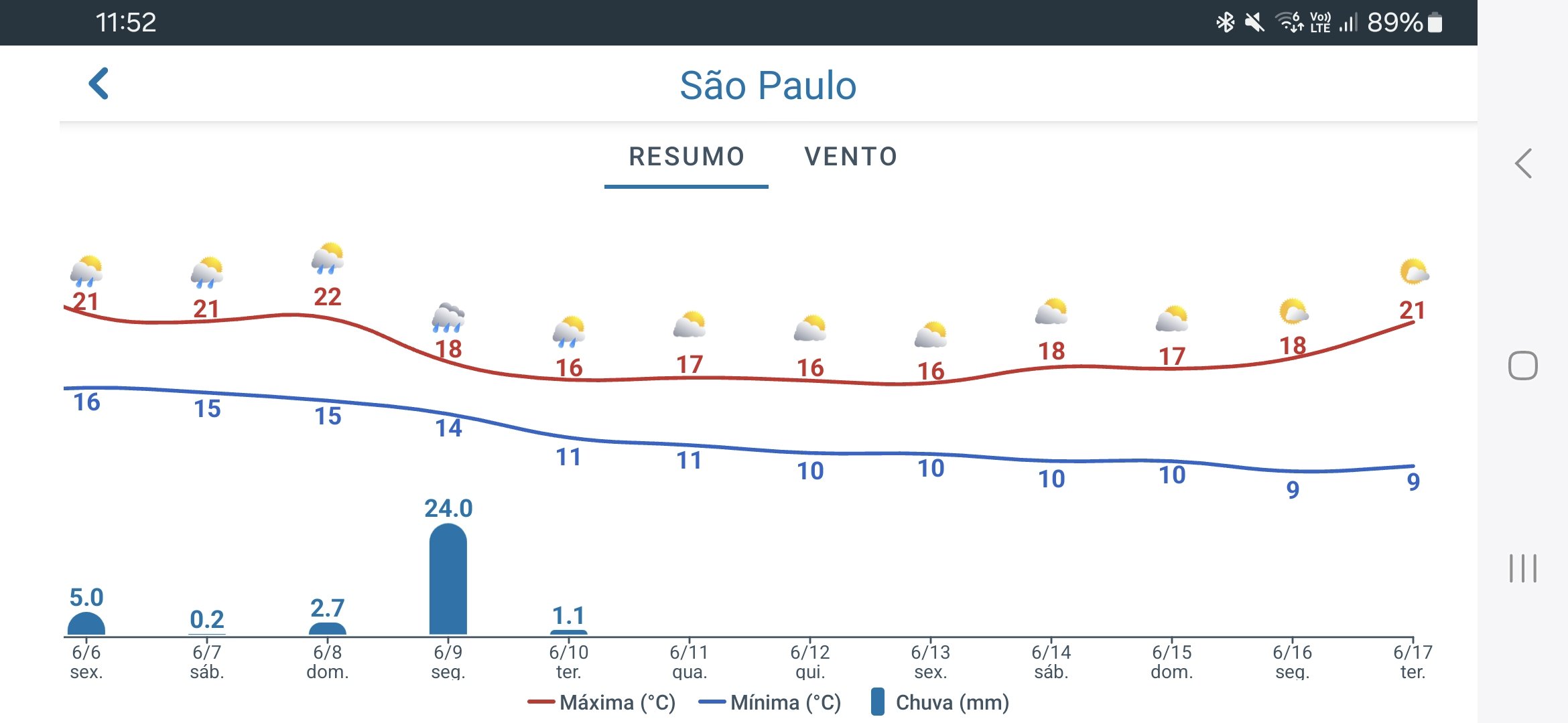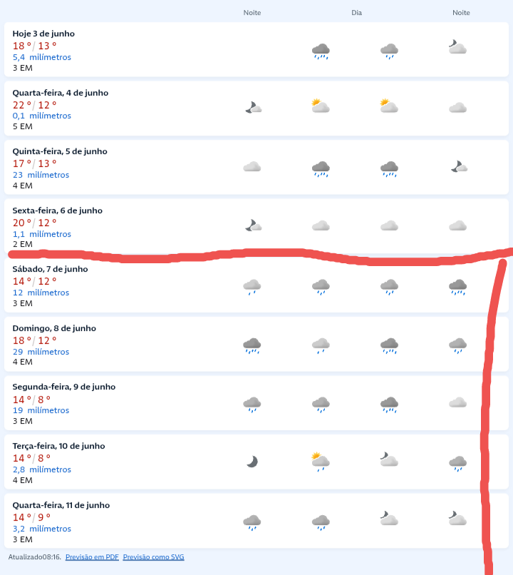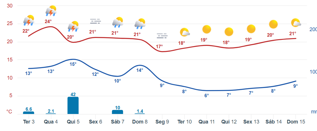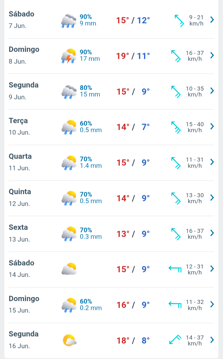 LucasFSopranos Posted June 3, 2025 at 02:21 PM Share Posted June 3, 2025 at 02:21 PM Aqui veio a chuva prevista, começando por volta das 8h da manhã, bem fraca, e se intensificou lá pelas 9h, com ventania e muitos raios, além daqueles trovões que fazem tremer o chão. A temperatura caiu de 17,9°C para 13,7°C às 10h, com a força da chuva. Acumulou 23 mm até agora. Agora, com 14,7°C e chuva fraca. A previsão para os próximos 10 dias está bem interessante. Segundo ela, a maior temperatura nos próximos 10 dias seria de 26°C, em um único dia. Todos os outros terão máxima abaixo disso e, depois do dia 9, vem um período com máximas entre 19°C e 22°C e mínimas entre 8°C e 9°C 16 Link to comment Share on other sites More sharing options...