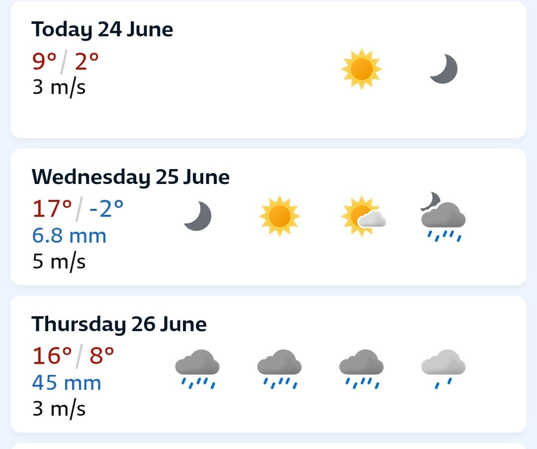 Felipe Backendorf Posted June 24, 2025 at 08:58 PM Share Posted June 24, 2025 at 08:58 PM Em Blumenau máxima de 15,3ºC no bairro Progresso com vento diminuindo bastante ao longo da tarde e parando totalmente. Nem 18h ainda e já faz 8,8ºC. Já já vai bater a mínima da manhã que foi 6,6ºC com vento médio na casa dos 8km/h. Na estação da defesa civil a máxima foi de 14,7ºC com umidade descendo a 27% Acho que vai a uns 2/3ºC na minha estação no bairro progresso 21 1 Link to comment Share on other sites More sharing options...