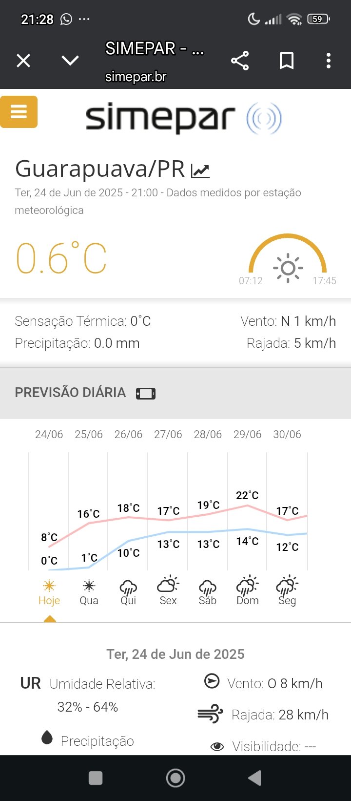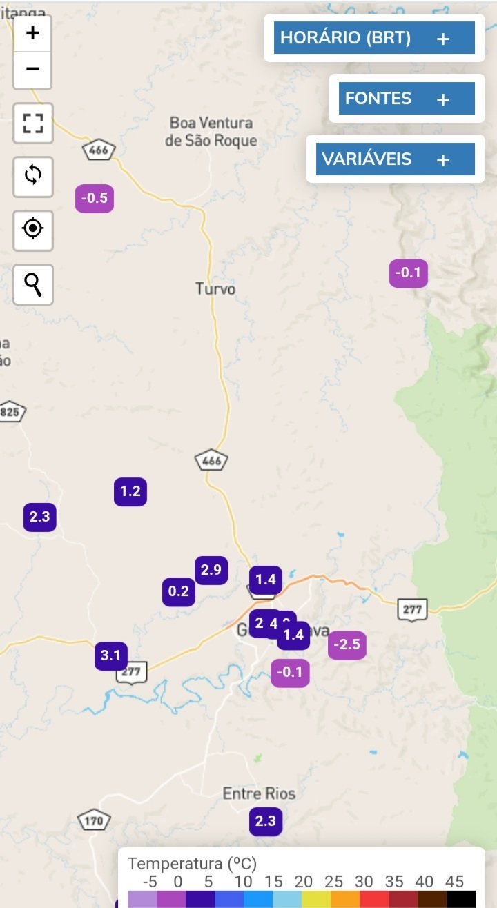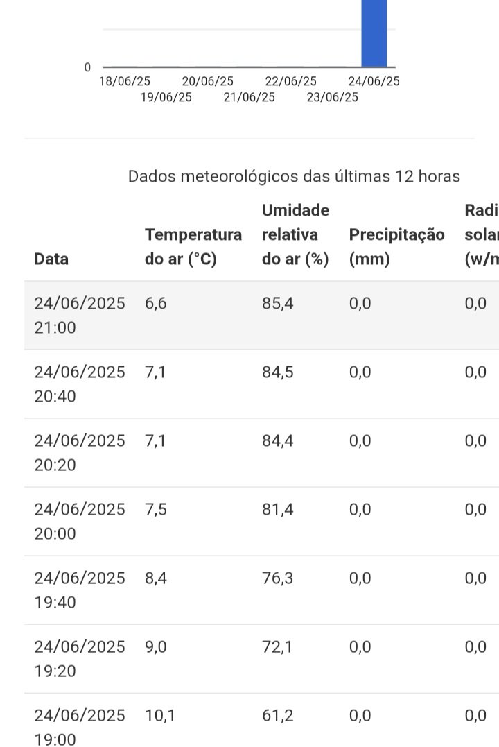 Rodrigo-GO Posted June 24, 2025 at 09:41 PM Share Posted June 24, 2025 at 09:41 PM Hj foi um dia interessante climatologicamente, mas muito frustrante. Coisas boas: a) mínima de 9.5°C em Licínio de Almeida-BA; b) precipitação de 12 mm na estação da minha casa (raro pra Junho); c) máxima abaixo da média (23.7°C); d) recorde de mínima absoluta de todas as minhas estações, 7.0°C negativo (https://www.wunderground.com/dashboard/pws/ISOJOA64). Decepção: desde ontem falta energia na Agrodala e devido a isso a estação do Horizonte está offline há mais de 40 horas. Depois de muita insistência a Copel restabeleceu o fornecimento mas durou pouco e novamente está sem energia (mandaram uma foto pra mostrar o frio de lá hj). Já a estação do bairro Roscio, na cidade de Palmas-PR, conseguimos colocar online ontem mas novamente a Internet caiu e tb está offline. Quando estiver no sul em julho vou passar lá e vamos trocar a estação do Roscio pra um lugar com Internet estável e no Horizonte vou fazer uma usina solar com bateria dedicada integralmente à estação e a Starlink. Creio que assim não passaremos mais essa frustração. Segue o baile. 23 2 3 Link to comment Share on other sites More sharing options...
