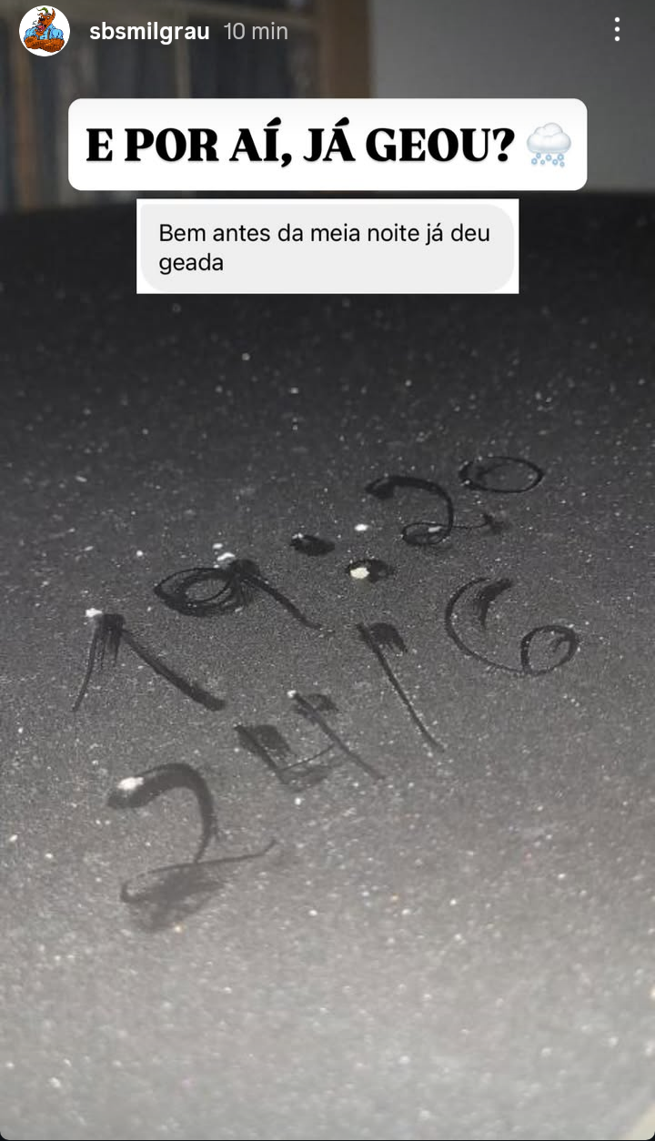 Serrano Posted June 24, 2025 at 11:15 PM Share Posted June 24, 2025 at 11:15 PM (edited) Máximas aqui na região hoje, com sol: 1,26°C Urupema/Morro das Torres 2,87°C Urubici/Mundo Novo 3,28°C São Joaquim/Cruzeiro 3,84 São Joaquim/Epagri 4,76°C Urubici/Vacas Gordas 7,7°C Lages/Epagri Muito gelo o dia inteiro nas encostas úmidas da Serra do Rio do Rastro, Corvo Branco, Panelão, Morro das Torres. Aqui em casa também! Uma bomba histórica nos topos e quem sabe nas baixadas. Desde 2021 não tínhamos algo deste calibre. Edited June 24, 2025 at 11:16 PM by Serrano 19 6 Link to comment Share on other sites More sharing options...