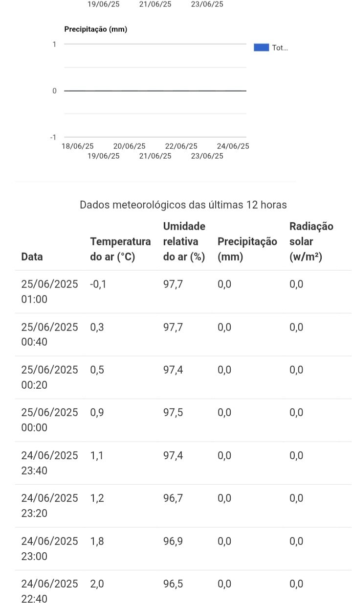 Luide Luckmann Posted June 25, 2025 at 09:47 AM Share Posted June 25, 2025 at 09:47 AM Em 24/06/2025 em 21:34, Luide Luckmann disse: General Carneiro/INMET com -3,2 às 21h, a mesma que fazia em 29/07/21, um dia antes do recorde de -7,3 da estação, se não bater vai chegar bem perto. -7,5 até agora, recorde da estação e pode cair mais 12 6 Link to comment Share on other sites More sharing options...