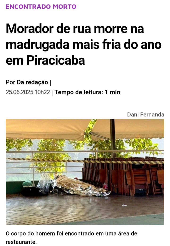 Erik K. dos Santos Posted June 26, 2025 at 03:32 AM Share Posted June 26, 2025 at 03:32 AM (edited) Pela primeira vez desde o início das documentações, tivemos, infelizmente, uma fatalidade devido a frio extremo em Piracicaba (SP) – mesmo que suspeita. Um morador de rua, que se recusou a dirigir a um abrigo municipal fornecido pela Prefeitura, dormiu na área externa de um restaurante e foi encontrado sem vida ao amanhecer, possivelmente vítima de hipotermia. Edited June 26, 2025 at 03:33 AM by Erik K. dos Santos 1 22 Link to comment Share on other sites More sharing options...
