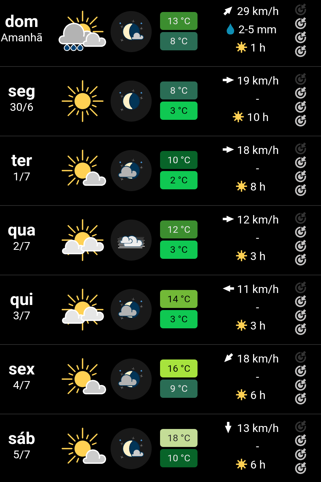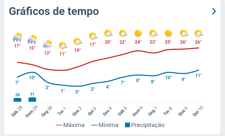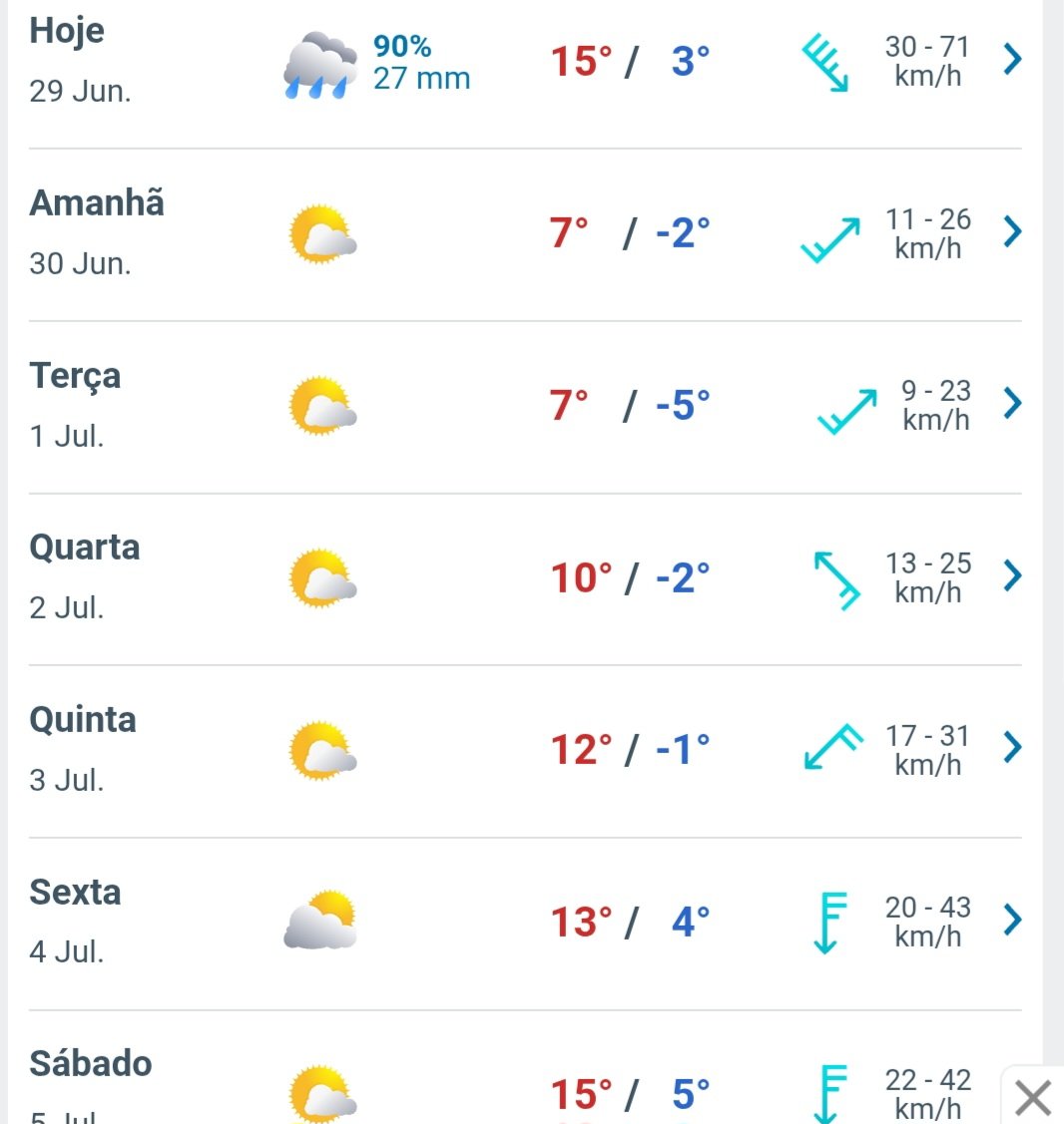 Leandro A M Leite Posted June 29, 2025 at 01:49 PM Share Posted June 29, 2025 at 01:49 PM (edited) Previsão para Cuiabá/MT no meu aplicativo do Weather Channel: 29/06 17ºC/33ºC 30/06 13ºC/18ºC 01/07 13ºC/20ºC 02/07 13ºC/23ºC 03/07 14ºC/25ºC 04/07 15ºC/28ºC 05/07 16ºC/31ºC Edited June 29, 2025 at 01:54 PM by Leandro A M Leite 10 Link to comment Share on other sites More sharing options...