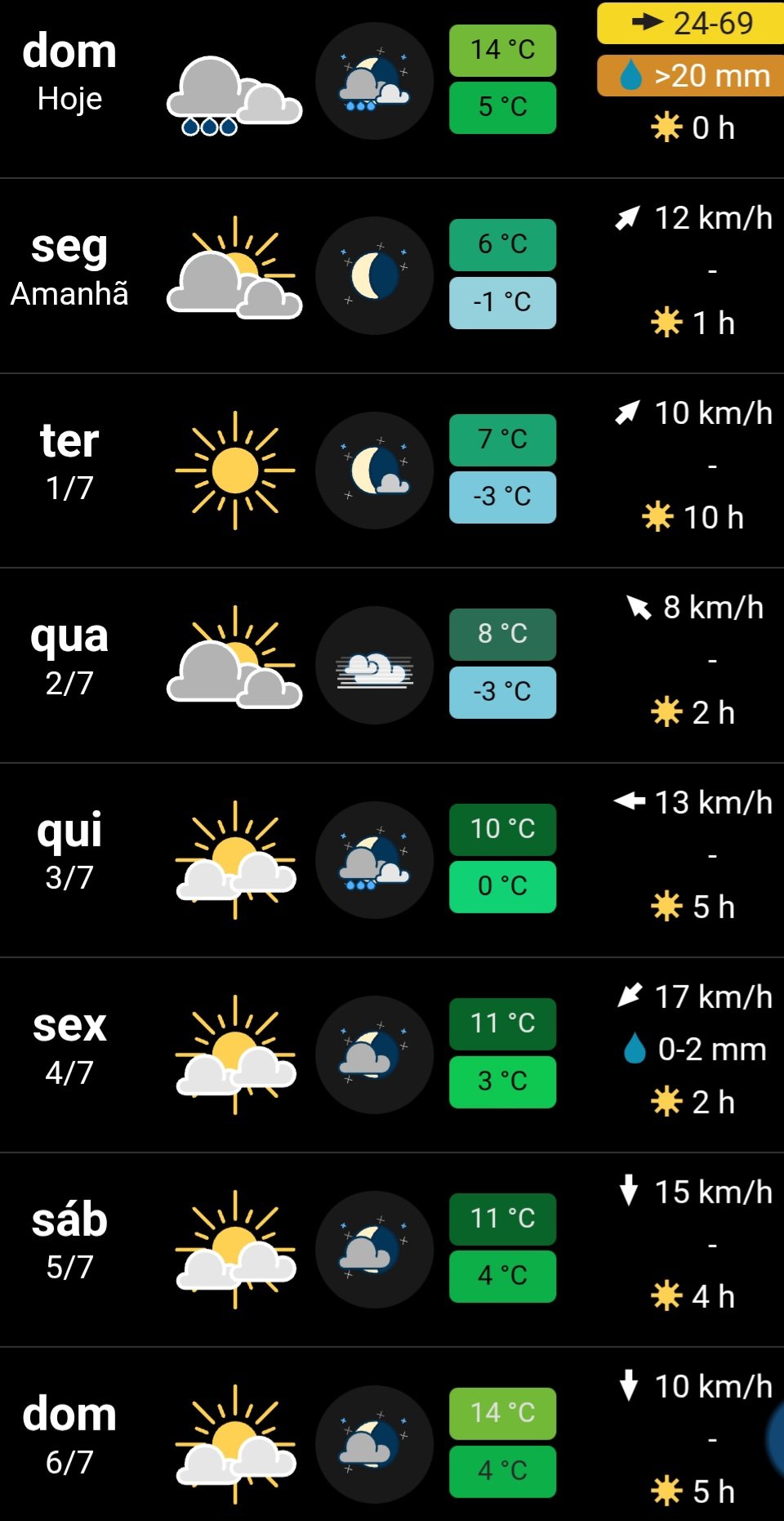 Serrano Posted June 29, 2025 at 10:36 AM Share Posted June 29, 2025 at 10:36 AM Amanhecer com 10,6°C e chuva fraca/moderada. São Joaquim com quase 100 mm nas últimas 48 hrs. Aqui entre 42 e 69 mm, mas vai aumentar. Esta é a previsão de véspera: Meteored coloca um aquecimento nas máximas (18-21°C) por 4 dias a partir do dia 6. Algo que será muito bem-vindo e aproveitado depois de um longo período com média máxima de 12-14°C e T média diária em 8-10°C. No final da grade surgiu outra MP. TWC mais conservador tanto nas mínimas quanto nas máximas, não mostra muito aquecimento. 14 4 Link to comment Share on other sites More sharing options...