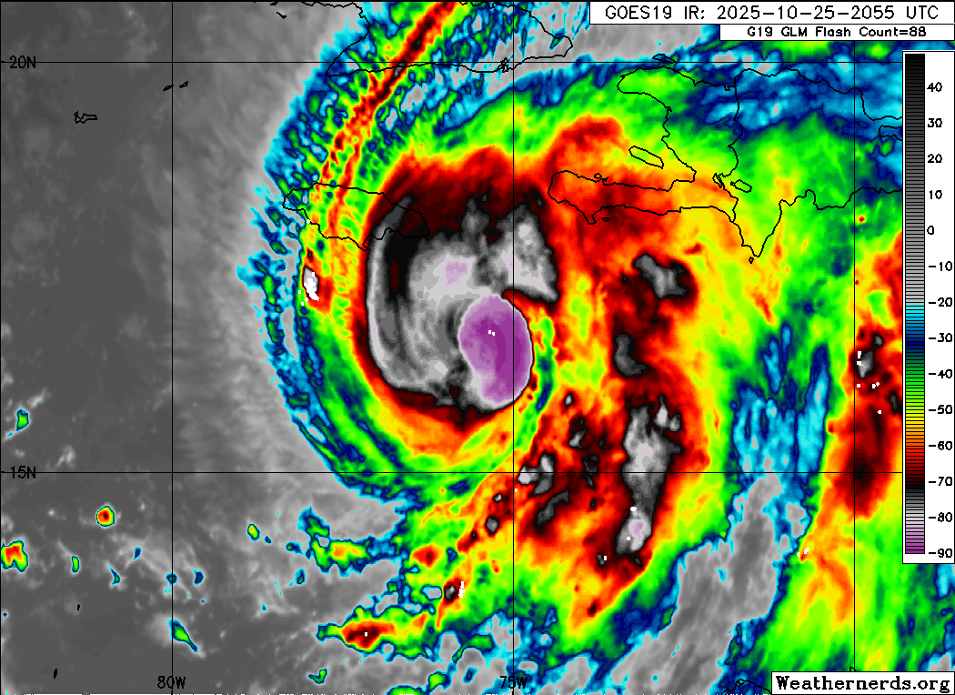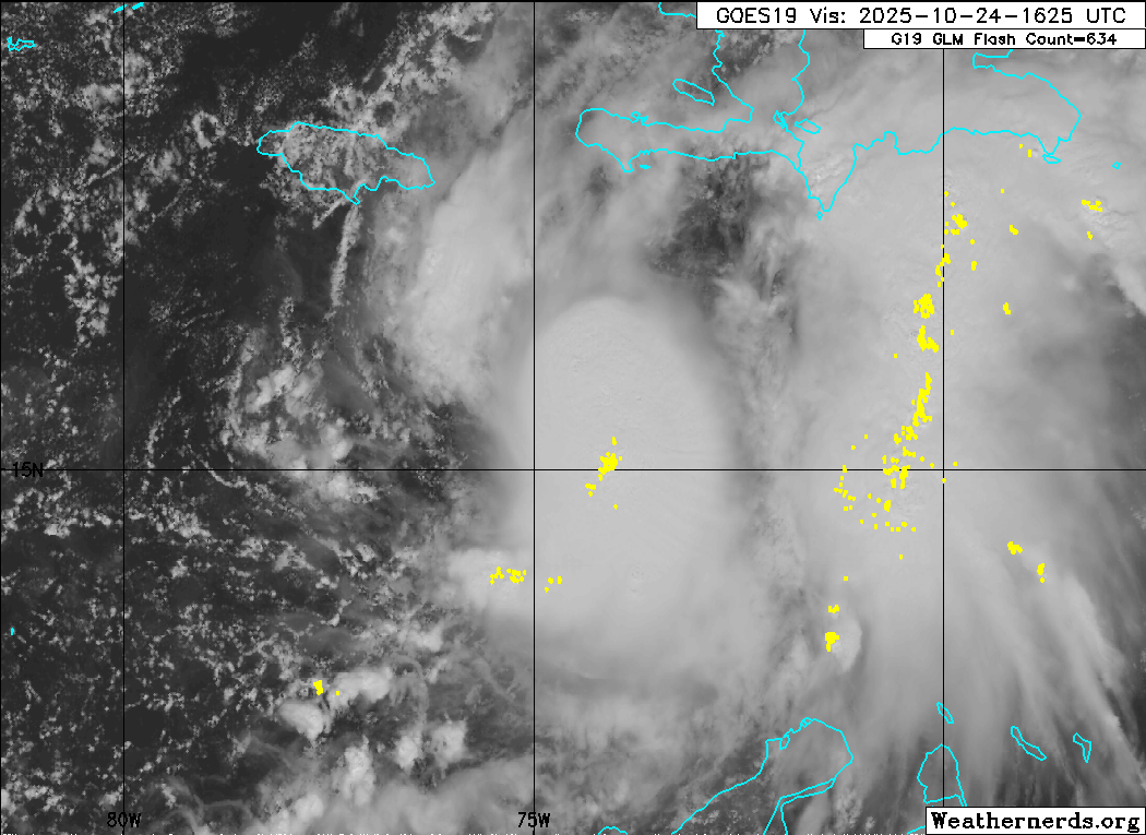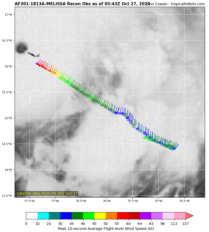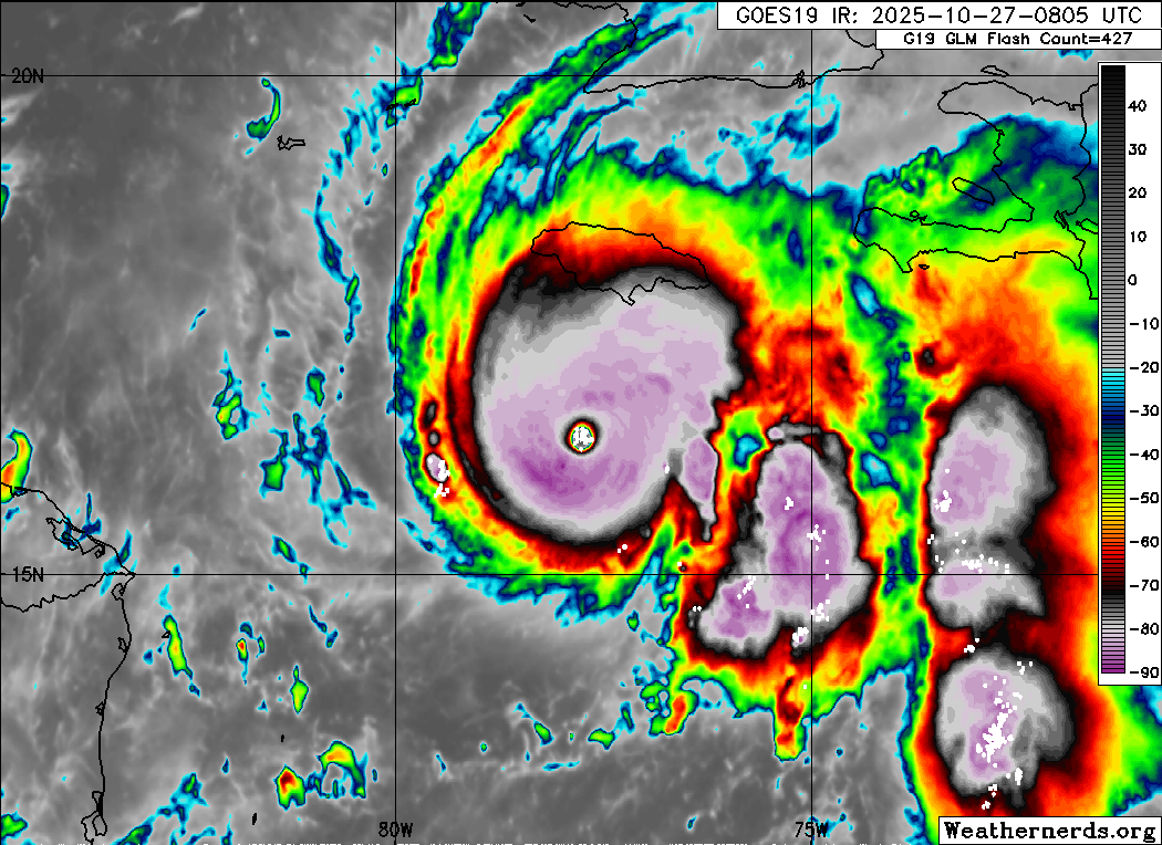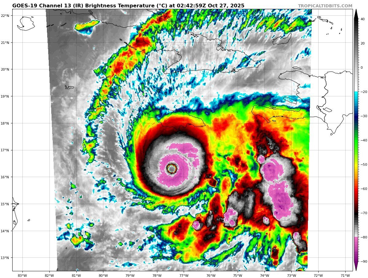 Felipe F Posted October 27, 2025 at 05:39 PM Share Posted October 27, 2025 at 05:39 PM SUMMARY OF 200 PM EDT...1800 UTC...INFORMATION ---------------------------------------------- LOCATION...16.5N 78.3W ABOUT 145 MI...230 KM SW OF KINGSTON JAMAICA ABOUT 325 MI...525 KM SW OF GUANTANAMO CUBA MAXIMUM SUSTAINED WINDS...175 MPH...280 KM/H PRESENT MOVEMENT...WNW OR 285 DEGREES AT 3 MPH...6 KM/H MINIMUM CENTRAL PRESSURE...906 MB...26.76 INCHES 2 Link to comment Share on other sites More sharing options...
