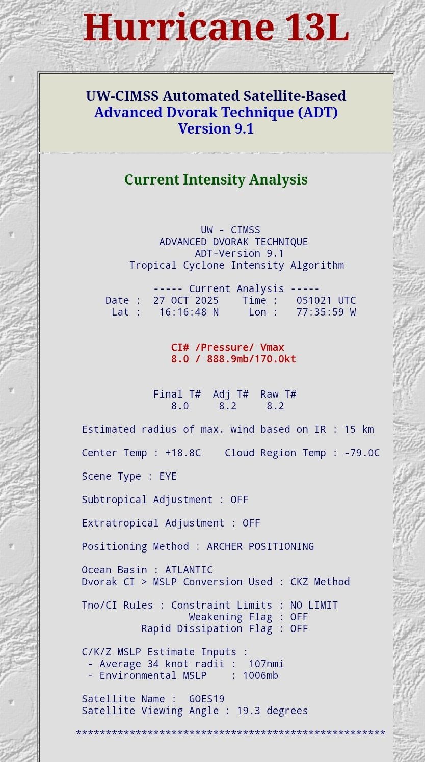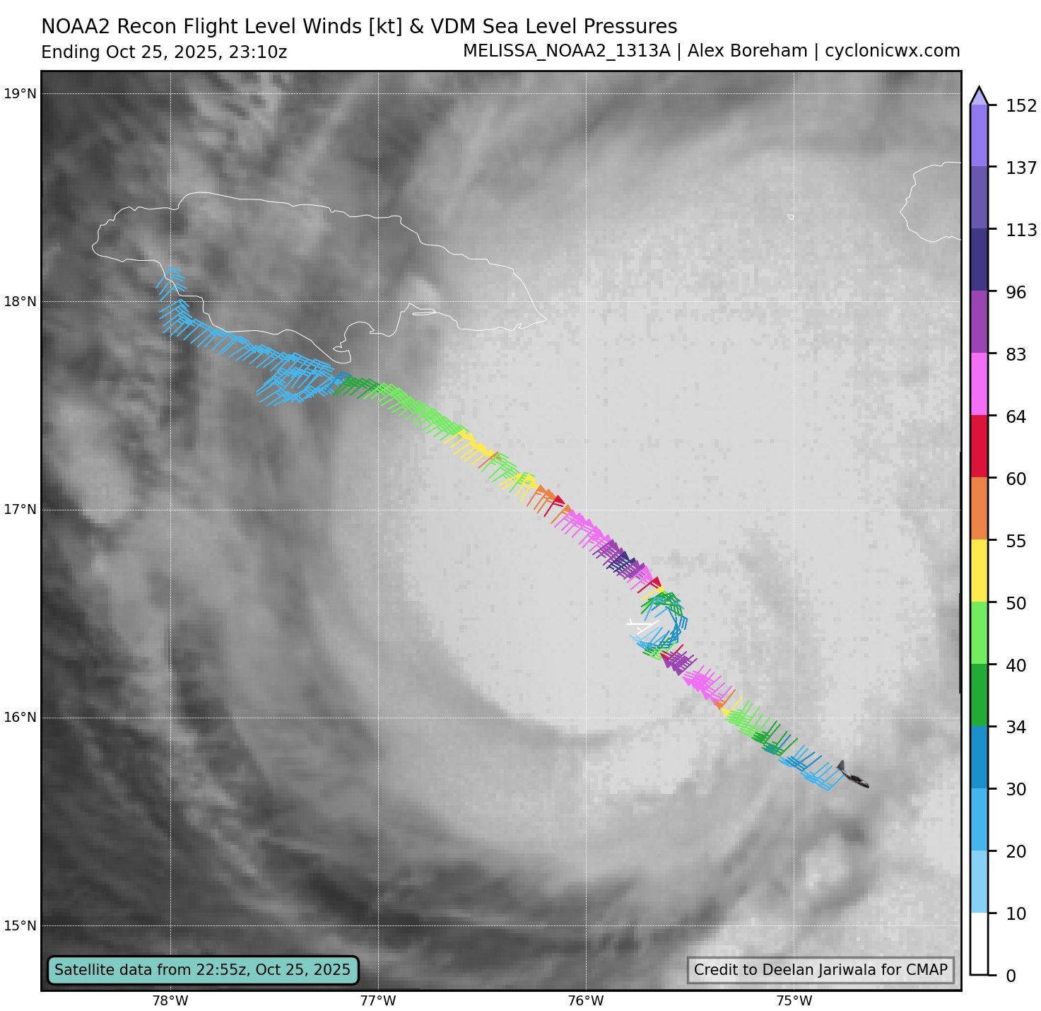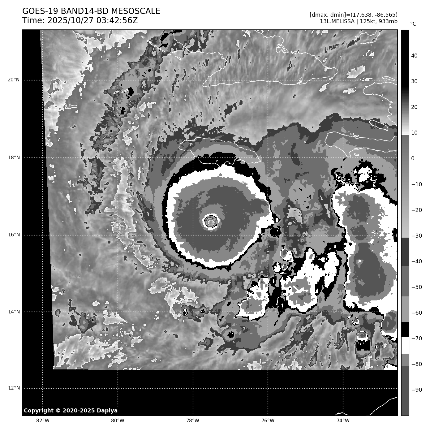 Felipe F Posted October 27, 2025 at 05:39 PM Share Posted October 27, 2025 at 05:39 PM SUMMARY OF 200 PM EDT...1800 UTC...INFORMATION ---------------------------------------------- LOCATION...16.5N 78.3W ABOUT 145 MI...230 KM SW OF KINGSTON JAMAICA ABOUT 325 MI...525 KM SW OF GUANTANAMO CUBA MAXIMUM SUSTAINED WINDS...175 MPH...280 KM/H PRESENT MOVEMENT...WNW OR 285 DEGREES AT 3 MPH...6 KM/H MINIMUM CENTRAL PRESSURE...906 MB...26.76 INCHES 2 Link to comment Share on other sites More sharing options...