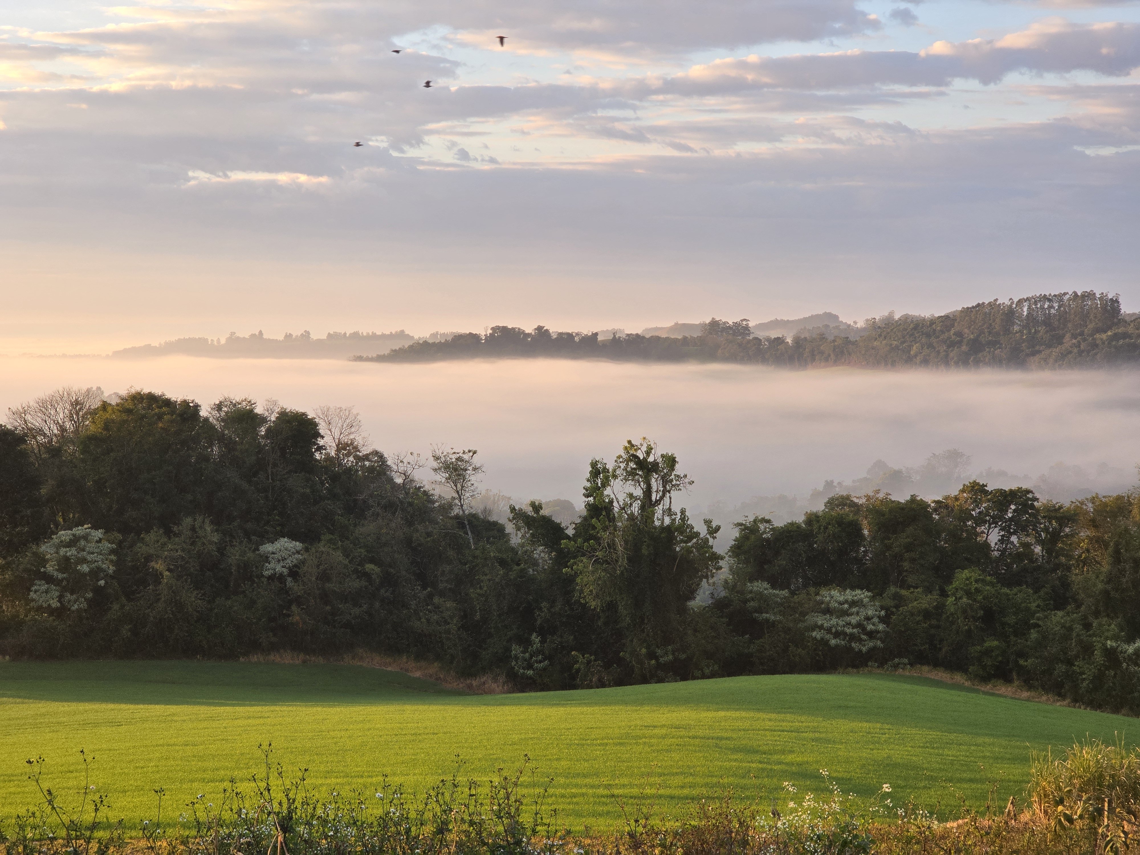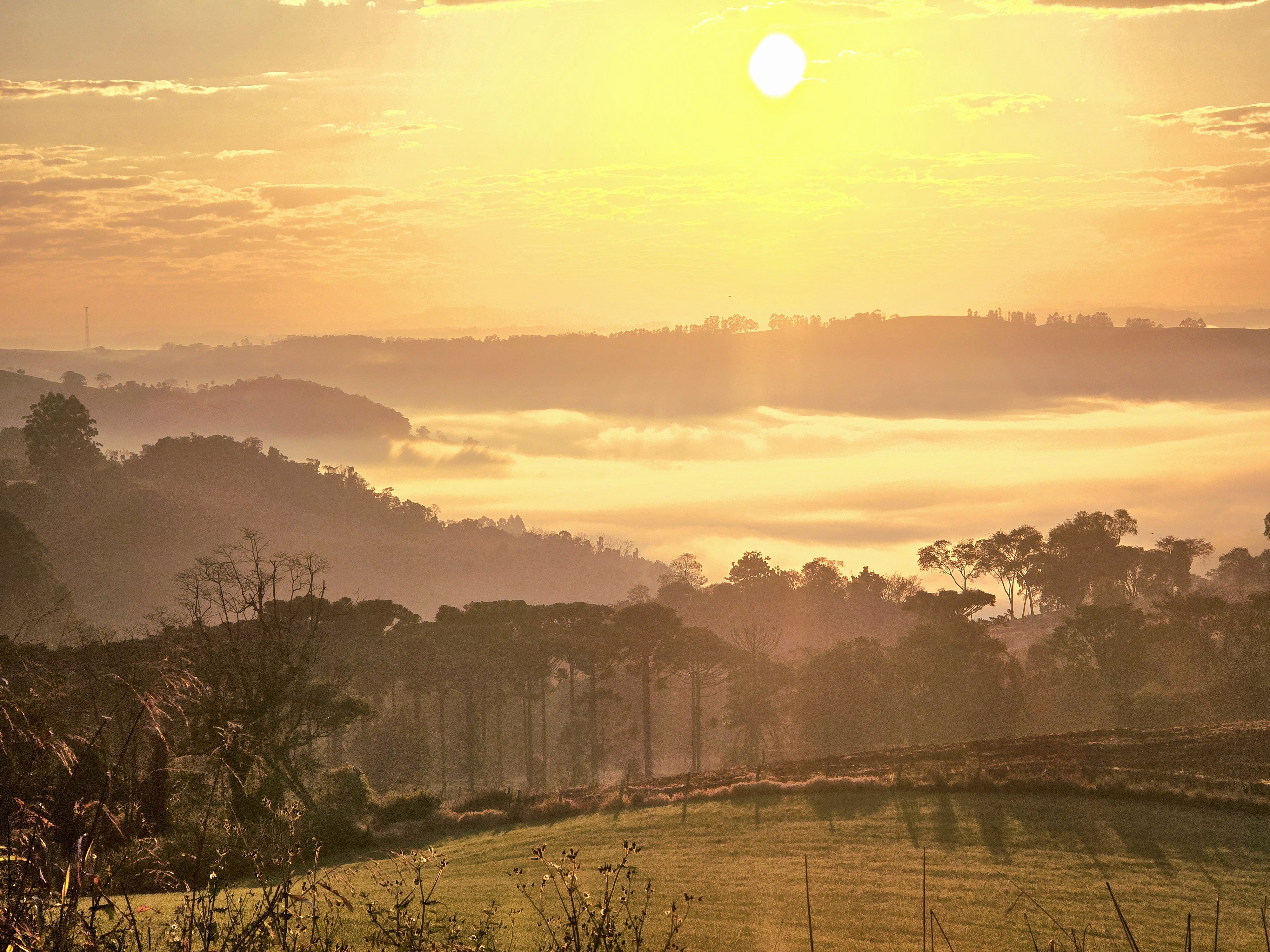 jean10lj Posted July 21, 2025 at 11:47 PM Share Posted July 21, 2025 at 11:47 PM Hoje esquentou mais, mas ainda assim o mês segue bom, especialmente pela média mínima baixa. Iporã do Oeste: Mínimas Máximas 6.3/24.2 Flor e Ser (520m baixada) 6.5/23.8 Taquarussu (310m vale) 6.9/25.4 Wickert (455m vale) 12.1/23.8 Letras (575m topo) 10.8/21.5 São Vendelino (600m topo) Amanhecer... Por acaso estava num local com vista bem de longe do local da estação de Linha Taquarussu hoje, alí que fez -4,2 em julho 2021. Para baixo dos chiqueiros lá no fundão: 22 4 Link to comment Share on other sites More sharing options...