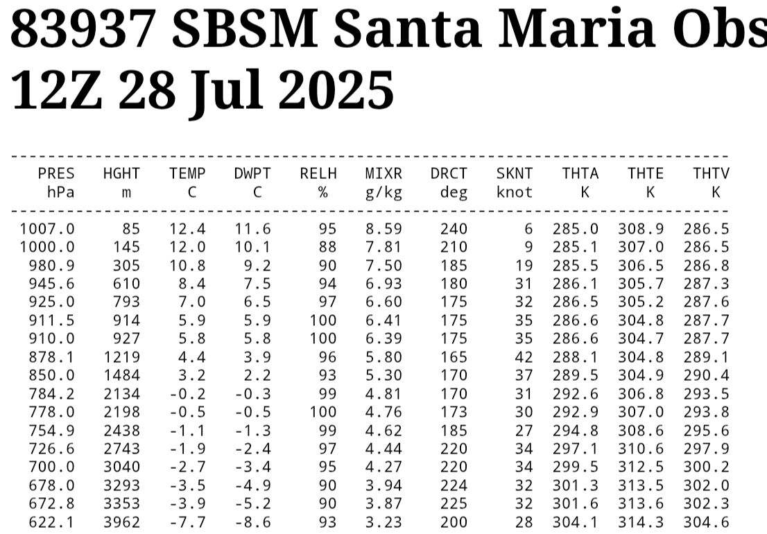 Caio César Posted July 28, 2025 at 02:12 PM Share Posted July 28, 2025 at 02:12 PM Janela aberta para a ocorrência de precipitação invernal a partir das 15h indo até final da noite, no máximo até o início/meados da madrugada, nos pontos acima dos 1500/1600m da serra geral em SC. O perfil de frio disponível na atmosfera agora guarda algumas semelhanças, porém estará mais frio do que no evento da neve de setembro de 2022. GFS 00Z 23/09/2022 FIELD TEMPERATURE TEMPERATURE TEMPERATURE TEMPERATURE TEMPERATURE PRECIPITATION LEVEL 850 MB 800 MB 750 MB 700 MB 650 MB UNITS DEGC DEGC DEGC DEGC DEGC MM HR + 0. 2.9 -0.3 -1.8 -3.2 -6.1 0.99 + 3. 1.1 -2.0 -2.0 -3.4 -4.4 0.00 + 6. 0.4 -2.6 -1.3 -3.6 -5.0 0.00 + 9. -0.4 -1.8 -0.9 -2.6 -3.2 0.00 + 12. 1.0 -1.1 0.2 -1.4 -1.4 0.00 + 15. 4.9 0.5 -0.4 0.6 0.4 0.00 + 18. 6.7 1.9 -1.4 2.3 1.2 0.00 + 21. 5.6 1.3 -0.8 3.6 1.6 0.00 + 24. 3.9 1.5 3.4 4.9 1.5 0.00 GFS 00Z 28/07/2025 FIELD TEMPERATURE TEMPERATURE TEMPERATURE TEMPERATURE TEMPERATURE PRECIPITATION LEVEL 850 MB 800 MB 750 MB 700 MB 650 MB UNITS DEGC DEGC DEGC DEGC DEGC MM HR + 0. 10.1 7.2 4.7 2.1 -0.7 14.95 + 3. 8.9 6.6 4.0 0.6 -3.0 1.52 + 6. 7.3 4.4 1.6 -1.2 -4.1 0.67 + 9. 4.8 1.7 -0.8 -3.4 -5.5 1.27 + 12. 2.6 -0.3 -1.5 -3.6 -5.8 0.74 + 15. 1.2 -1.9 -3.5 -4.7 -5.5 0.43 + 18. 1.1 -1.9 -4.3 -4.2 -6.1 0.79 + 21. 1.2 -1.3 -2.4 -3.5 -7.0 0.17 + 24. 0.3 -2.5 -0.7 -3.5 -7.8 0.03 + 27. -0.4 -1.9 -0.3 -4.1 -8.4 0.00 + 30. -0.9 0.5 -0.6 -3.9 -7.3 0.00 + 33. 1.5 -1.6 -0.9 -3.3 -6.0 0.00 + 36. 2.7 -0.7 -0.4 -1.4 -4.7 0.00 + 39. 1.6 -0.9 0.6 -0.5 -3.7 0.00 + 42. -0.2 0.7 1.4 0.2 -1.7 0.00 25 Link to comment Share on other sites More sharing options...