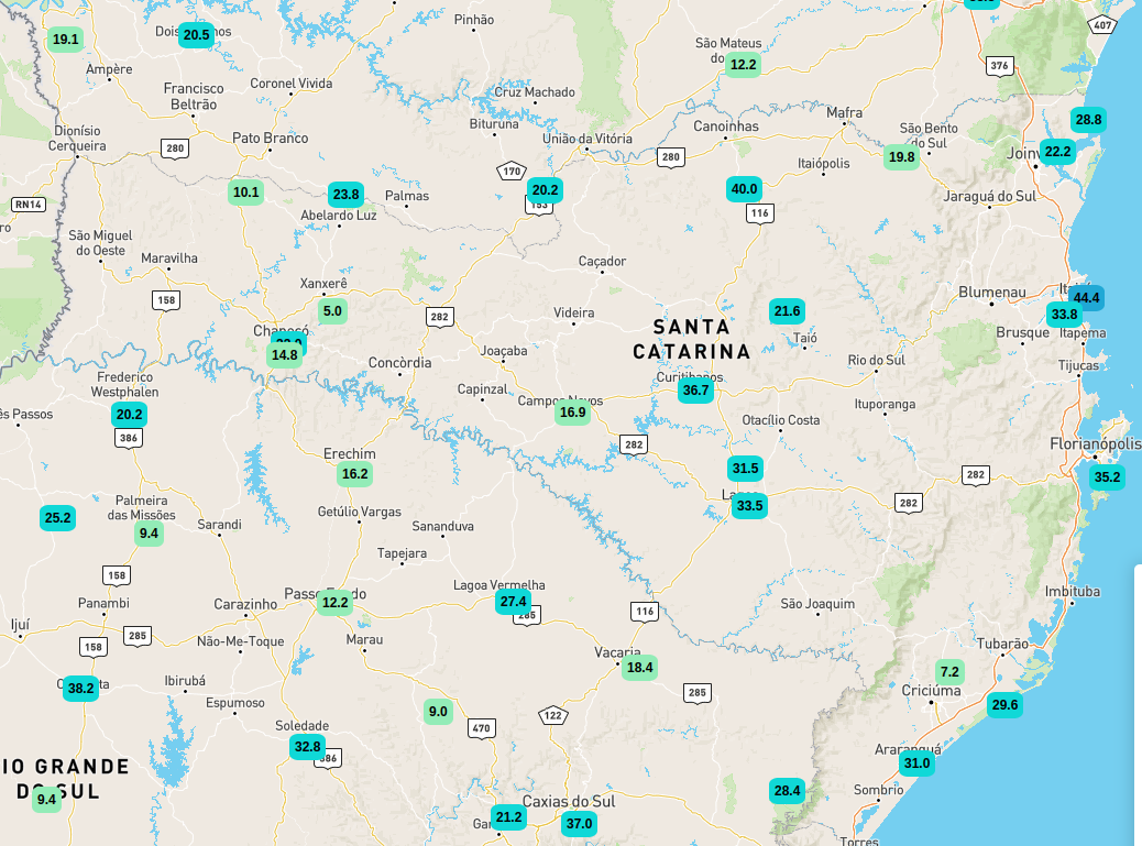 Moretão Posted July 28, 2025 at 11:33 PM Share Posted July 28, 2025 at 11:33 PM ☀️🌤️🌤️⛅☁️🌧️ Máxima: 27,5°C em Itapoá Mínima até o momento: 0,86°C↓ no Morro das Torres Menor máxima: 8,8°C no Morro das Torres Rajadas máximas até o momento: 132 km/h em Bom Jardim da Serra/Serra do Rio do Rastro 124,9 km/h em São Joaquim/Fabrini 123,4 km/h em Palhoça/Praia de Fora 106,6 km/h em Praia Grande/Serra do Faxinal 102,6 km/h em Imbituba/Barra de Ibiraquera 98,42 km/h no Morro das Torres 93,1 km/h em Florianópolis/Campeche 87,84 km/h em Siderópolis/Barragem São Bento 86,9 km/h em Penha/Armação do Itacoporói 86,7 km/h em Balneário Rincão 83,7 km/h em Itajaí/Cabeçudas 82,3 km/h em Santa Rosa de Lima/Santa Bárbara 81,36 km/h em Rancho Queimado/Vinícola Terramilia 80,28 km/h em Tubarão/Cetuba 79,6 km/h em Navegantes/SBNF 78,66 km/h em Major Gercino/Campinho 77,2 km/h em Joinville/Serra Smith 74,27 km/h em Siderópolis/Barragem São Bento 74,55 km/h em Jaraguá do Sul/Barra do Rio Cerro 74,4 km/h em Trombudo Central/DCSC 74,2 km/h em Aurora/DCSC 72,8 km/h em Vitor Meireles/DCSC 72,4 km/h em São Francisco do Sul/Paulas 70,6 km/h em Araranguá/Operária e Lages/INMET 70,2 km/h em Curitibanos/INMET Precipitação máxima até o momento: 20,8 mm em São Joaquim/Perícó > Máximas baixas apenas no topo da serra. > Já esfriou bastante e quem sabe teremos negativa ainda hoje. 🙏 20 1 Link to comment Share on other sites More sharing options...