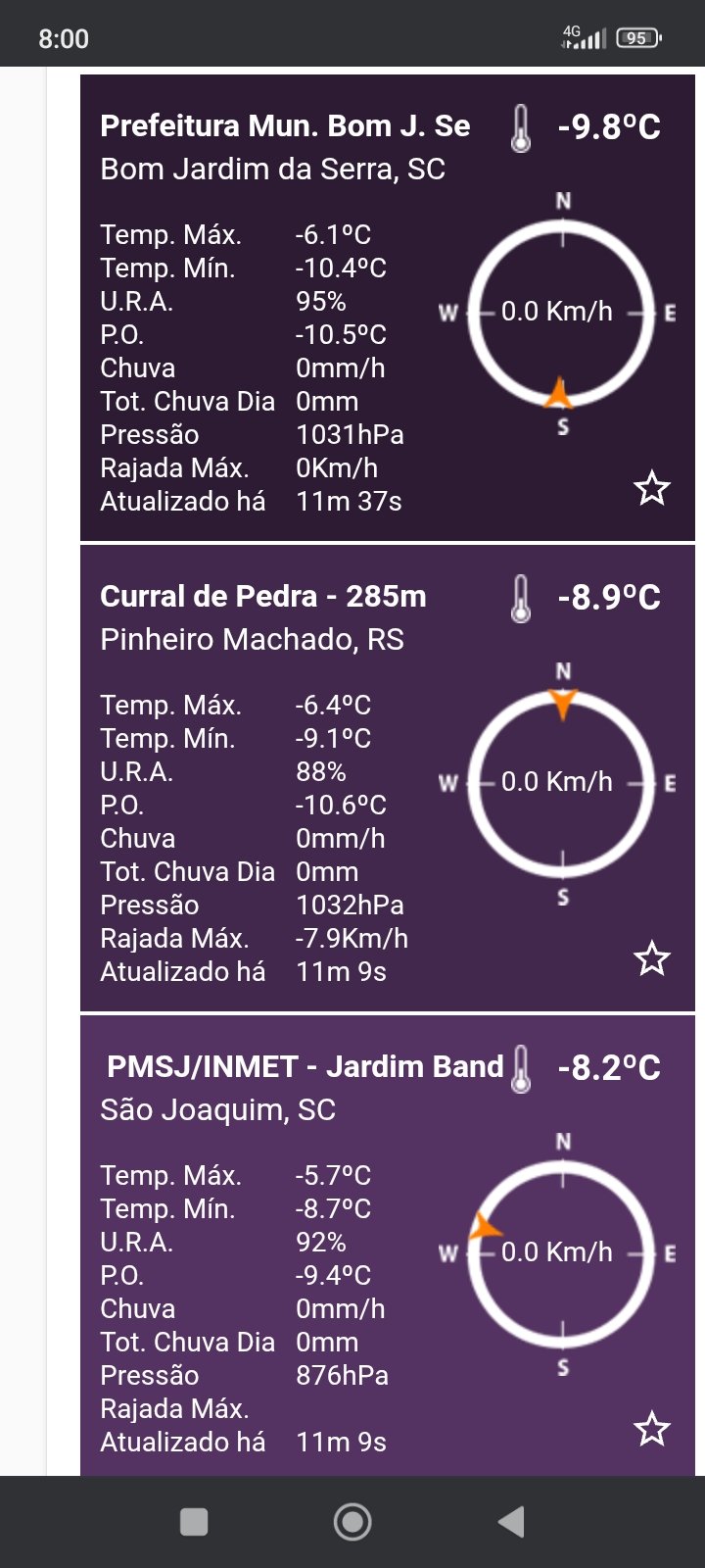 Misael Matos Posted July 2, 2025 at 10:59 AM Share Posted July 2, 2025 at 10:59 AM (edited) Legal é que nos 3 dias da MP, Pinheiro Machado quebrou a menor máxima (3,9°), menor mínima no topo (-3,6°), menor máxima na baixada ( 5,3° ), e quase bateu a menor mínima também ( -9,1° )😕😁 Edited July 2, 2025 at 11:01 AM by Misael Matos 18 8 Link to comment Share on other sites More sharing options...