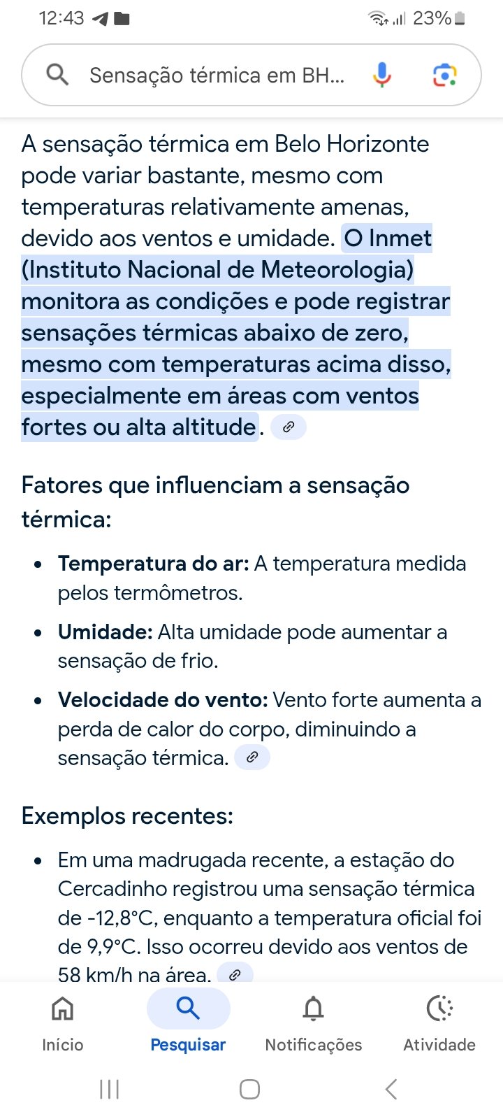 geovane gomides Posted August 1, 2025 at 03:58 PM Share Posted August 1, 2025 at 03:58 PM Em 01/08/2025 em 08:48, Eclipse POA disse: BH só perde para Caçador e Soledade E REAL? OU BULLYING com os belo horizontinos? Quem divulga a sensação térmica em BH E O Lizandro Gemiacki, meteorologista do Inmet responsável pelo Inmet em Belo Horizonte. Levando em consideração que tem bairros na cidade acima de 1000 metros de atitudes, é considerável bem possível tem sensação térmicas bem baixa. 6 Link to comment Share on other sites More sharing options...