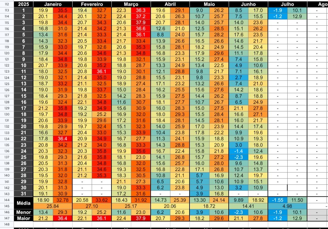 pindorama Posted July 2, 2025 at 07:19 PM Share Posted July 2, 2025 at 07:19 PM Curitiba está numa sequência de máximas incrível. 9C ontem e hoje 7C (caso não suba nas próximas horas). Curitiba tem média máxima de julho em 19C, isso daria -10/-12 em relação à média. Aqui a média de julho é de 21C. Nunca vi uma máxima de 9C por aqui, o máximo foi em 2010 com 11,x. Ontem tivemos máxima de 13,3C, em isto em 12 anos de leitura. Para vocês verem o quão difícil é uma máxima realmente baixa por aqui. Claro, tem muita máxima invertida ocultando dias até com sub10C durante a tarde. 23 Link to comment Share on other sites More sharing options...