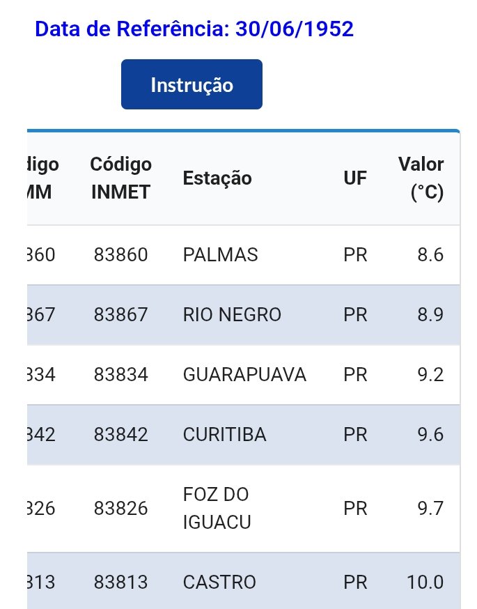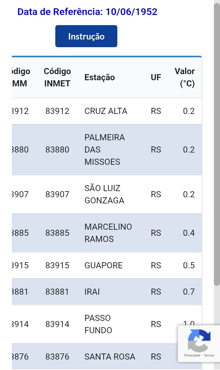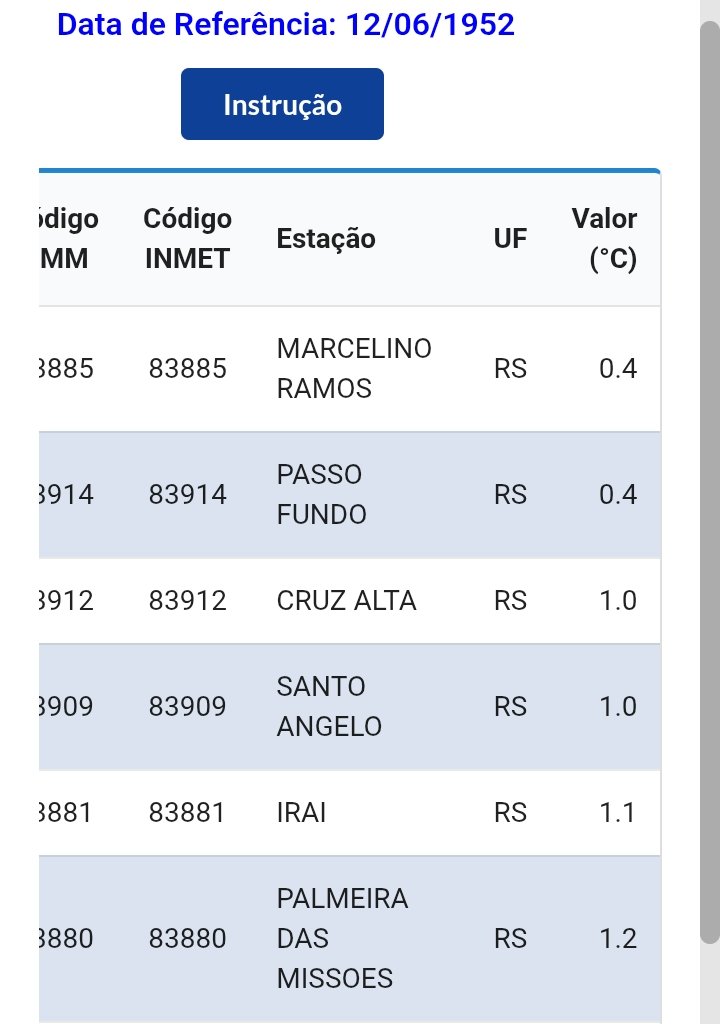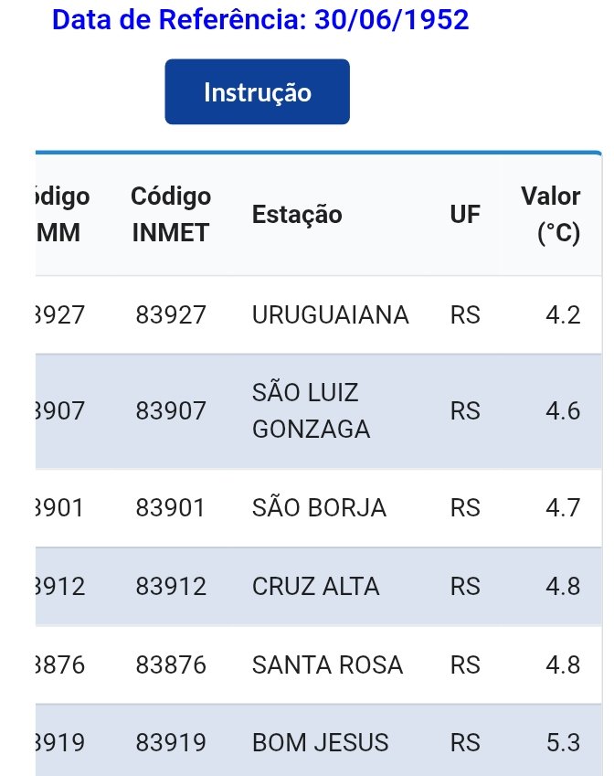 Carlos Campos Posted July 2, 2025 at 10:15 PM Share Posted July 2, 2025 at 10:15 PM Em 02/07/2025 em 19:00, Carlos Campos disse: Legal - e eu já tinha garimpado esses dados de estações próximas na data em questão (30/06) - inclusive salvei - mas como faz bastante tempo, acho que em 2019, não encontro mais. Problema que agora não estão mais no banco de dados INMET. Me parece que houve mínimas em torno de -1/-2°C em Xanxerê (o buraco do frio naquela época longínqua). Esses valores não condizem com -14 em Caçador, jamais. Vou ver se acho num dos meus 490 pendrives kkk Abraço Pronto, achei ufa... Isso abaixo acaba com a dúvida e trás uma certeza: Não teve esse -14°C no dia 30/06/1952 em parte alguma desse país! Tá aí a data do evento, no RS - No Paraná, Palmas bem próxima de Caçador (e mais fria provavelmente) teve 8,6°C - No dia anterior - E no dia posterior - 01/07 - Assim encerra essa questão... 17 4 Link to comment Share on other sites More sharing options...