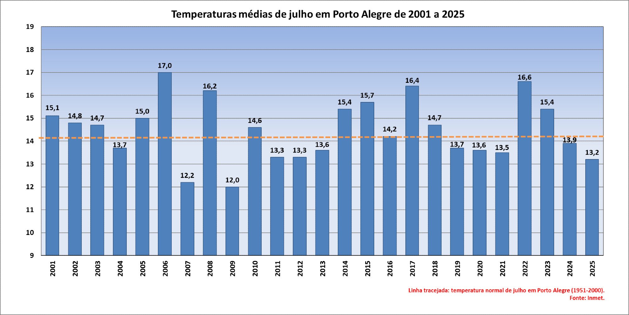 Pedro Gabriel Posted August 16, 2025 at 12:40 PM Share Posted August 16, 2025 at 12:40 PM Bom dia galera! Não sei se alguns se lembram mas no X(antigo Twitter) tinha aquela página do Artur Jacobus de São Leopoldo - RS onde ele compartilhava dados da estação dele e previsões dos modelos, agora ele esta na rede Bluesky pois o X já não permite postagens automáticas da estação meteorológica. Dito isso, ele sempre fazia uma média de temperatura do mês e postava um gráfico atualizado desde 2001 das temperaturas médias aqui de Poa, achei interessante postar esses dados de Junho e Julho pois desde 2011 os 2 meses não fechavam com média negativa consecutiva 14 5 Link to comment Share on other sites More sharing options...