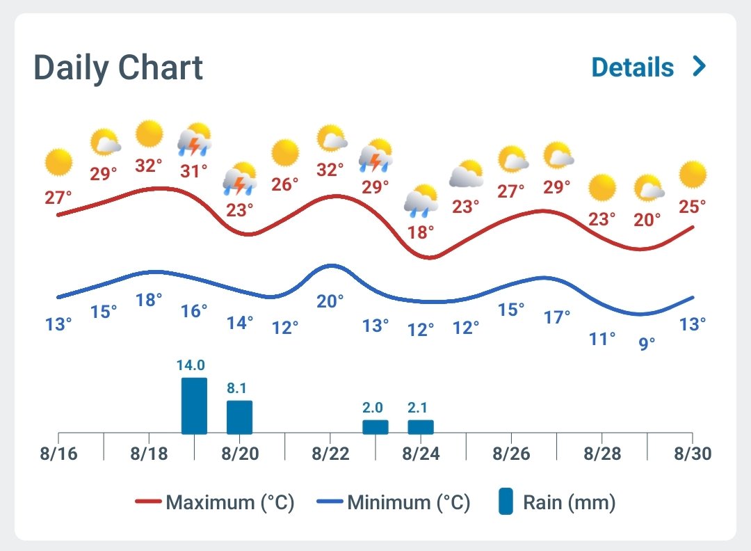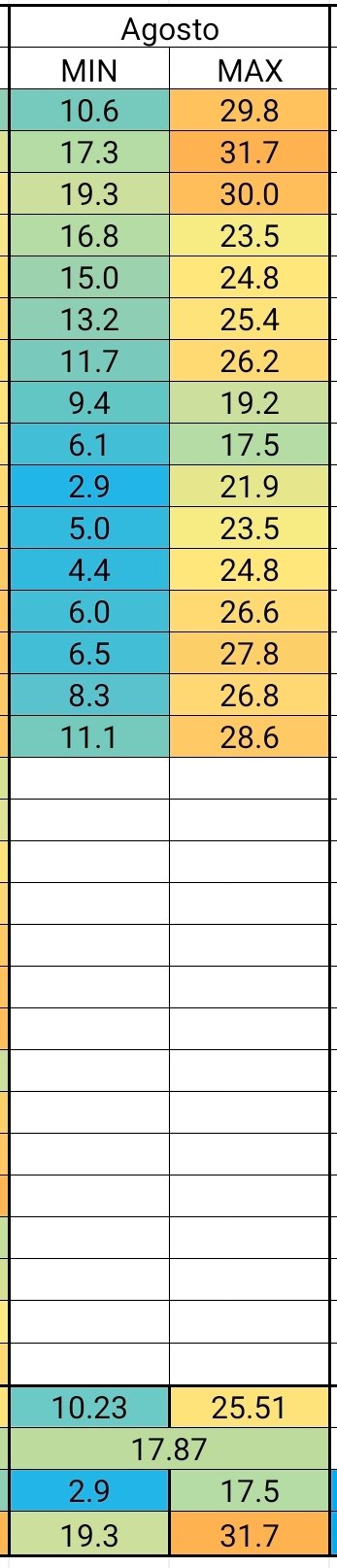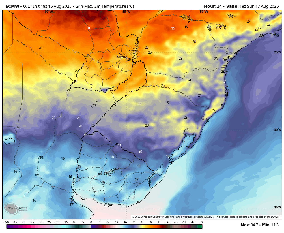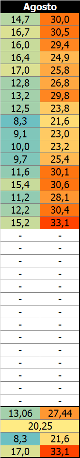 Felipe S Monteiro Posted August 16, 2025 at 09:28 PM Share Posted August 16, 2025 at 09:28 PM Desde sábado passado, a temperatura tem subido levemente dia após dia, mas nada de extraordinário, hoje a mínima horária foi de 13,3° e a máxima de 27,7°, UR chegou a 31%, anteontem tinha chegado a 24%, valor muito baixo para o padrão daqui. Nos últimos dias, estava previsto um grande aquecimento semana que vem em diante, mas parece que flopou, e a grade é a típica de agosto: períodos de calor seguidos por MPs de curta duração. Adicionando aqui o mês de agosto na estação Iapar de Iporã, ótima sequência de mínimas essa semana. 19 Link to comment Share on other sites More sharing options...