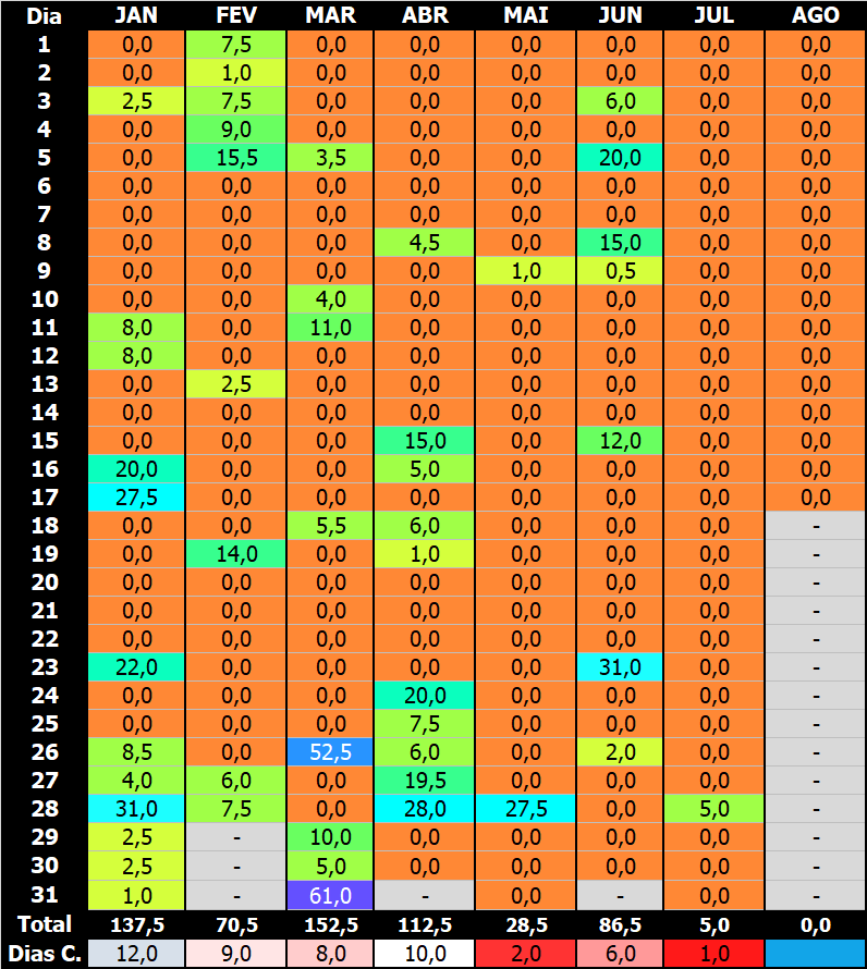 Adão Samir Posted August 17, 2025 at 12:03 PM Share Posted August 17, 2025 at 12:03 PM Buneas aqui no fronte do topo da serra gaúcha em São Francisco de Paula, Sol entre nuvens 12°C no momento.... *São Francisco de Paula* - 3°Trimestre 2025 AGOSTO Altitude nível do mar: 900 metros Coordenada: S 029.4478° W 050.5815° Hr. Coleta: 07h30min. Dia mm. Min. Max URA 01/08 00mm 14.7°C/ 23.2°C 26% 02/08 02mm 14.7°C/24.0°C 70% 03/08 48mm 12.3°C/14.2°C 90% 04/08 25mm 08.5°C/13.9°C 95% 05/08 00mm 08.2°C/13.1°C73% 06/08 00mm 08.3°C/17.5°C 55% 07/08 27mm 07.6°C/ 16.3°C 86% 08/08 44mm 03.1°C/ 07.7°C 86% 09/08 08mm 03.9°C/06.3°C 86% 10/08 00mm 03.1°C/ 08.6°C 82% 11/08 00mm 05.5°C/14.0°C 80% 12/08 00mm 07.3°C/15.0°C 44% 13/08 04mm 06.2°C/15.3°C 69% 14/08 00mm 04.7°C/10.1°C 62% 15/08 00mm 04.7°C/14.1°C 57% 16/08 00mm 07.8°C/15.5°C 47% 17/08 00mm 00°C / 00°C 18/08 00mm 00°C / 00°C 19/08 00mm 00°C / 00°C 20/08 00mm 00°C / 00°C 21/08 00mm 00°C / 00°C 22/08 00mm 00°C / 00°C 23/08 00mm 00°C / 00°C 24/0 00mm 00°C / 00°C 25/08 00mm 00°C / 00°C 26/08 00mm 00°C / 00°C 27/08 00mm 00°C / 00°C 28/08 00mm 00°C / 00°C 29/08 00mm 00°C / 00°C 30/08 00mm 00°C/00°C Acumulado de Junho 490mm Acumulado de Julho 170mm Acumulado de Agosto 158mm Acumulado do Trimestre *818mm* 15 Link to comment Share on other sites More sharing options...