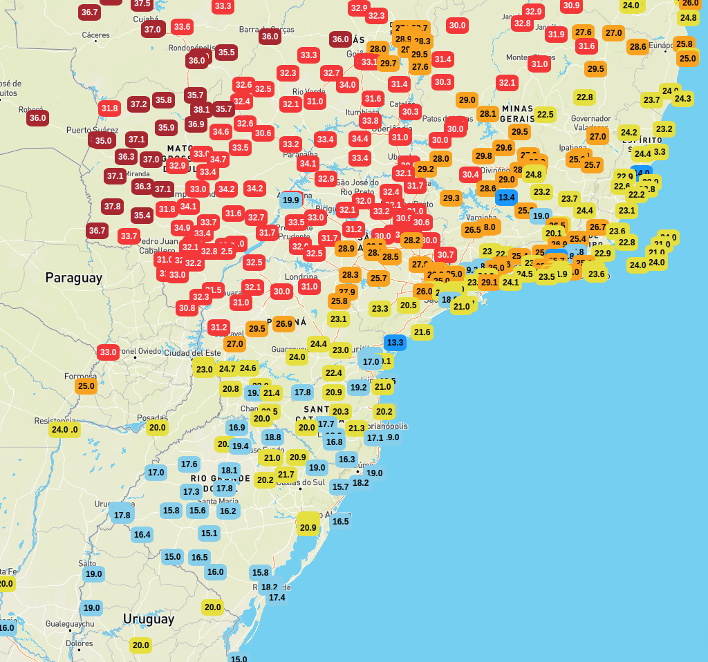 Renan Posted August 18, 2025 at 06:57 PM Share Posted August 18, 2025 at 06:57 PM Em 18/08/2025 em 15:29, Felipe Backendorf disse: Temperaturas 15h no Centro-sul com forte contraste: Incrível a facilidade de ocorrer temperaturas extremas no oeste brasileiro. A partir de agora é só calorão por lá, um clima medonho, que só é aplacado por rápidas entradas polares. Para lá, resta torcer para a temporada das chuvas começar logo. 23 Link to comment Share on other sites More sharing options...
