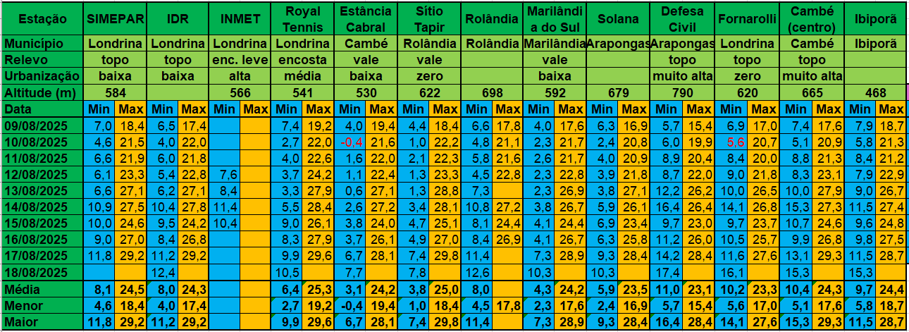 GABRIEL U. Posted August 18, 2025 at 02:18 PM Share Posted August 18, 2025 at 02:18 PM Temperaturas mínimas e máximas em estações de Londrina e região, do início da última onda de frio (sábado, dia 9) até hoje. Os dois valores em vermelho são estimativas, em casos em que as estações ficaram algum tempo sem registrar dados. Destaca-se a diferença entre as temperaturas mínimas nas baixadas e nos topos, especialmente na quinta-feira, dia 14, quando fez 16,4ºC em um topo no centro de Arapongas, e 2,6ºC em um vale dentro de um condomínio fora da área urbana, no município de Cambé, bem próximo a Londrina. Nesse último local, a média das mínimas nos últimos 10 dias foi de impressionantes 3,1ºC! Provavelmente, esse local já teve geadas em 7 dias, somente neste mês de agosto. Isso graças à persistência maior que o normal das ondas de frio, mas também ao tempo muito seco e estável. Quanto às previsões de calor frequentemente floparem neste ano, o que muitos já comentaram aqui, ontem talvez tenha sido mais um exemplo. A previsão do ECMWF e do GFS era que as temperaturas variassem de 13 a 31ºC, mas o observado foi um pouco menos: 11 a 29ºC. Muito bom! 19 1 Link to comment Share on other sites More sharing options...