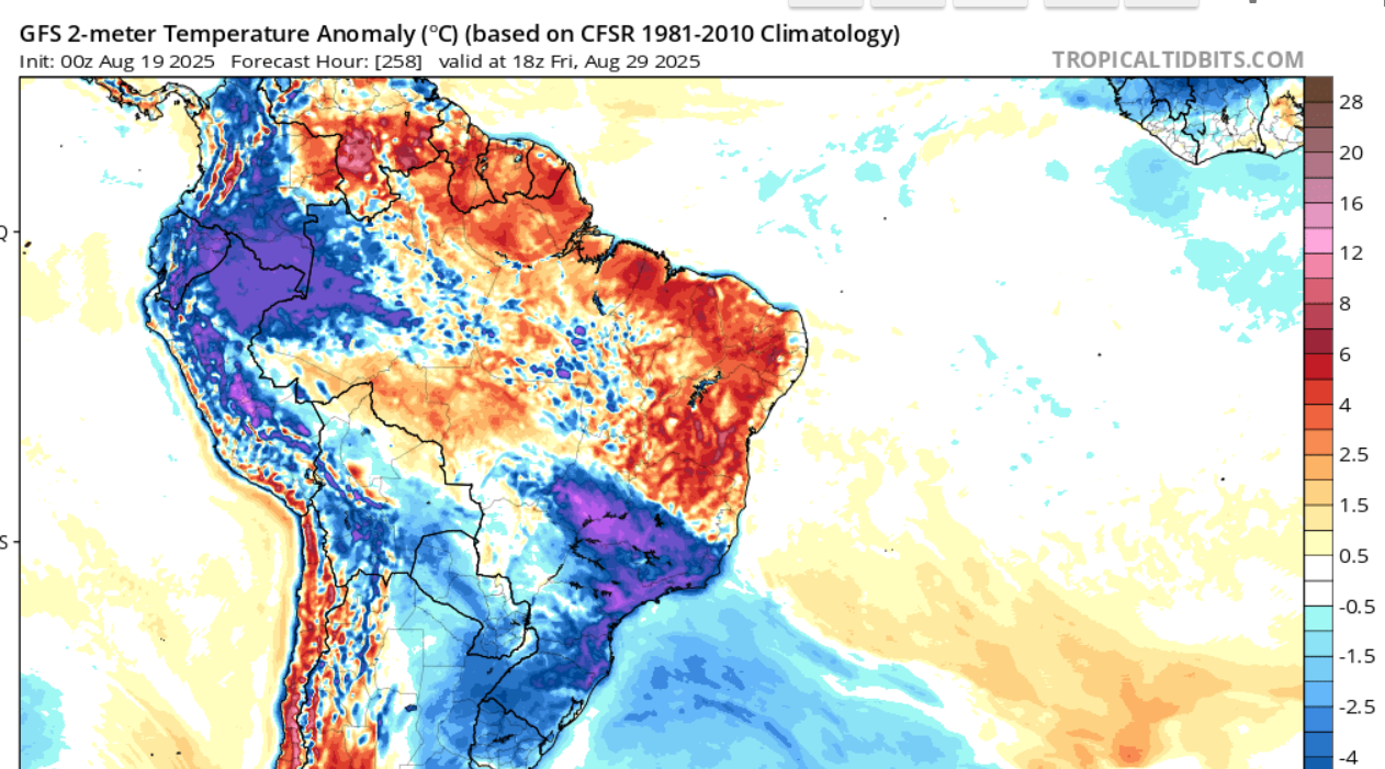 Renan Posted August 19, 2025 at 11:43 AM Share Posted August 19, 2025 at 11:43 AM GFS segue insistindo num forte pulso no final do mês, com a ocorrência de algo que ainda não aconteceu esse ano: Máximas bem baixas no leste do SE: O cenário não é seguido pelo Europeu. 16 5 Link to comment Share on other sites More sharing options...