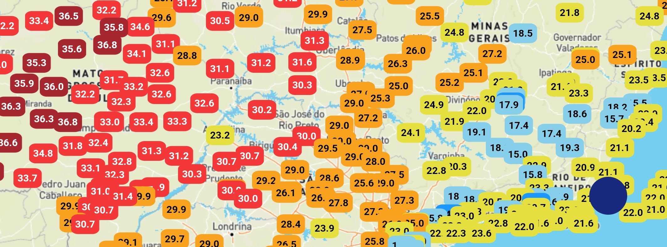 LeoP Posted August 30, 2025 at 08:59 PM Share Posted August 30, 2025 at 08:59 PM Tempo nublado e chuva em parte do Sudeste causa imenso gradiente térmico entre o oeste e leste do Brasil hoje. Em BH, o fim de tarde tem temperaturas entre 17° a norte e apenas 13°C na zona sul da cidade! 14 Link to comment Share on other sites More sharing options...