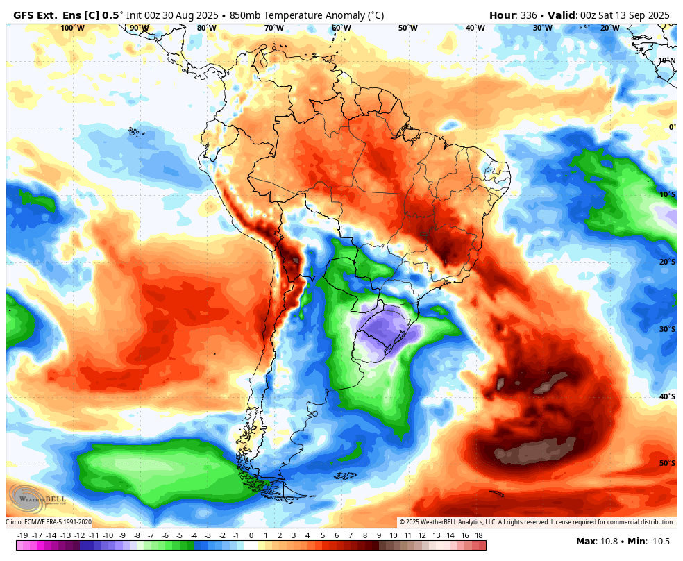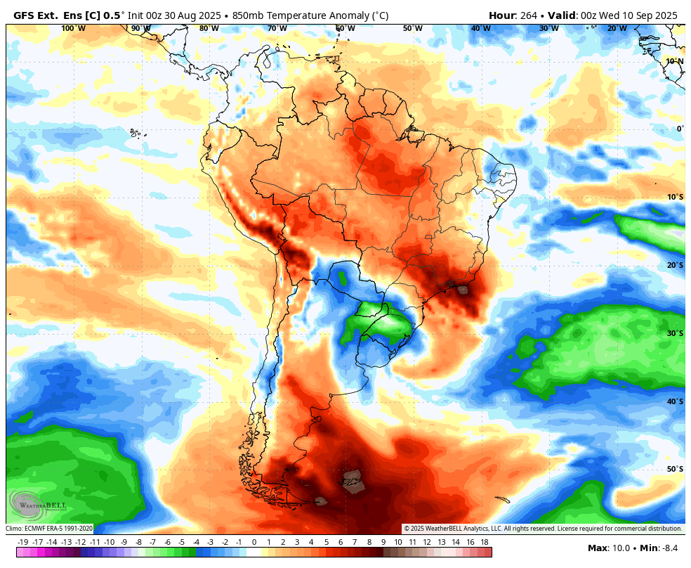 Caio César Posted August 31, 2025 at 10:09 AM Share Posted August 31, 2025 at 10:09 AM A considerar a rodada das 00Z do GFS estendido, setembro poderá reservar ainda boas emoções com uma série de incursões de ar frio alcançando o sul e centro-sul brasileiro. O problema é que tanto GFS quanto Euro estendidos variam bastante. Porém, melhor haver sinais aqui e acolá do ar frio podendo alcançar o Brasil do que estarem mostrando bloqueios impenetráveis. No geral os modelos vem entrando em acordo por duas incursões até o dia 13/09, já com intensidade interessante para o mês de setembro. Tendência da primeira quinzena ficar entre na média a abaixo da média no centro-sul se confirmarem as incursões que começam a se alinhar. 16 6 Link to comment Share on other sites More sharing options...