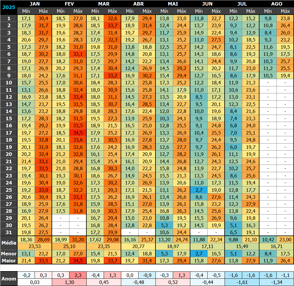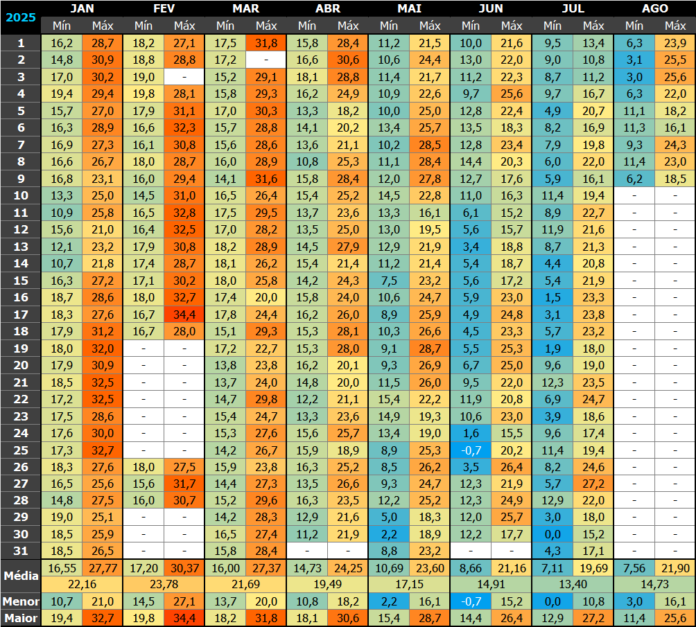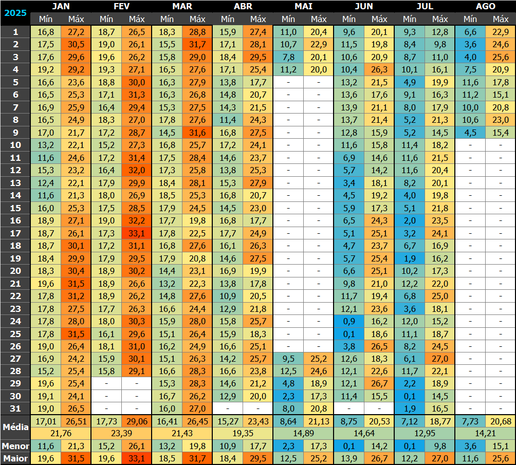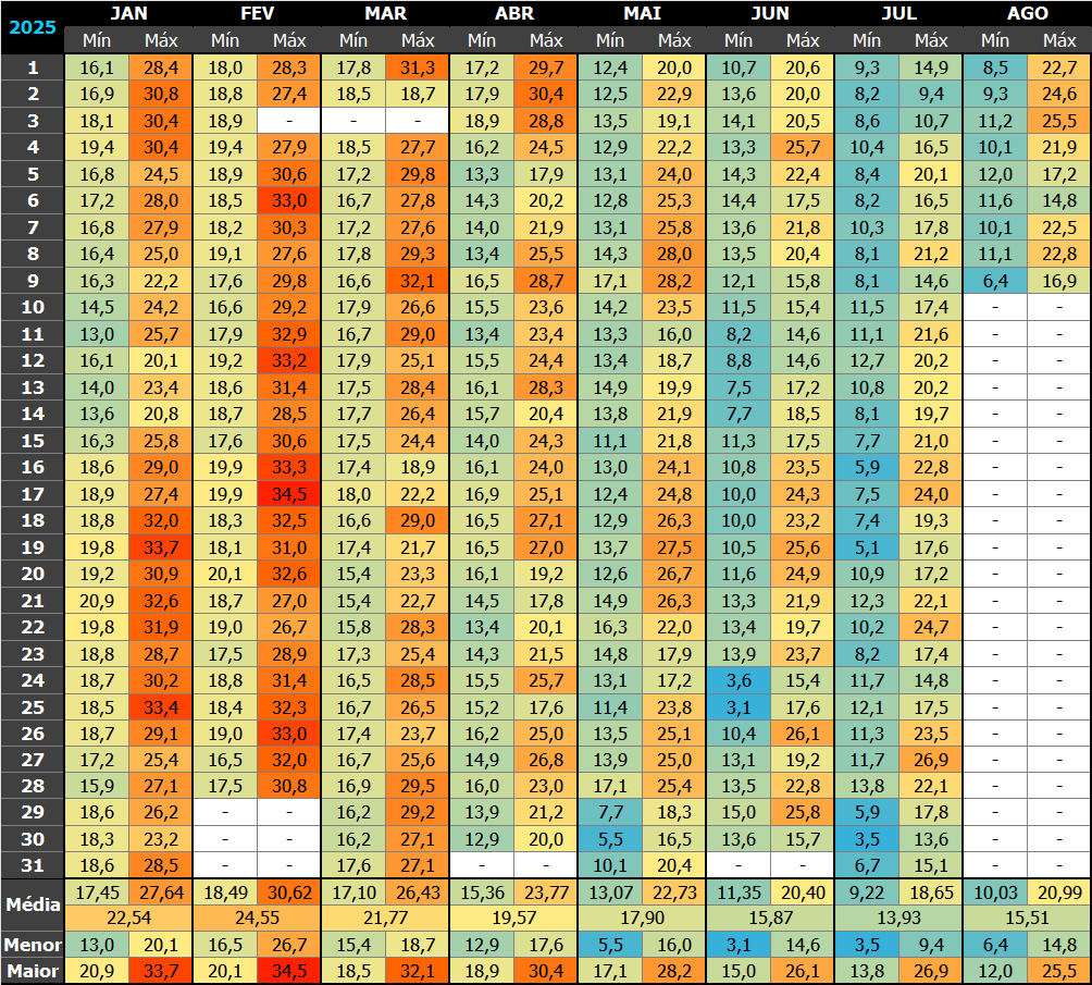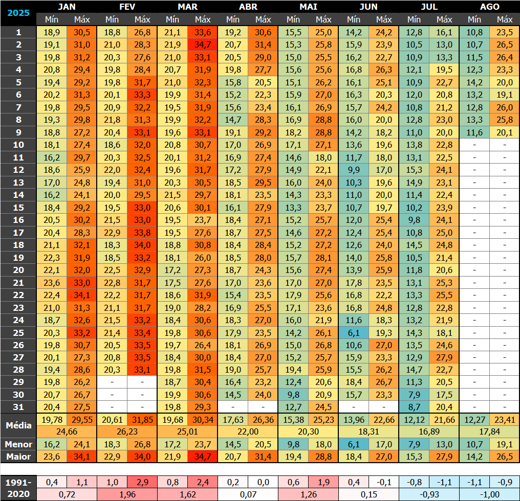 Rodolfo Alves Posted August 10, 2025 at 01:49 AM Share Posted August 10, 2025 at 01:49 AM OLHANDO A TABELA DO MIRANTE DE SANTANA, DE FATO ESTAMOS TENDO UM INVERNO ATÉ QUE BOM. OS 13,0ºC DE MÁXIMA DO COMEÇO DE JULHO FORAM BASTANTE SIGNIFICANTES.... DAS CAPITAIS DO SUDESTE, ACHO QUE SP ESTÁ TENDO O INVERNO MAIS SIGNIFICANTE.... ENQUANTO OUTRAS CAPITAIS DA REGIÃO ESTÃO "COMEMORANDO" NÃO ATINGIR 30.0ºC, MAS NÃO TEM UMA MÁXIMA ABAIXO DE 20ºC PRA CONTAR HISTÓRIA. 21 Link to comment Share on other sites More sharing options...